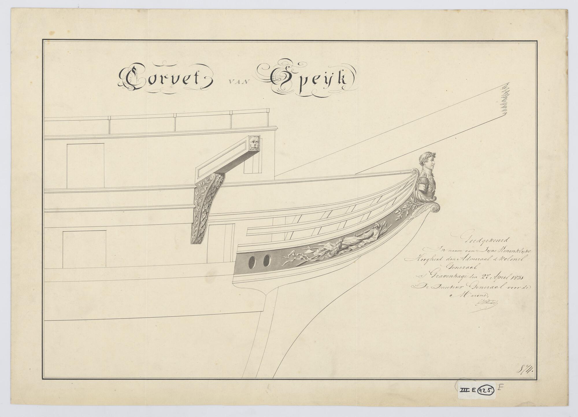 Scheg met borstbeeld van Van Speyk in groot tenue, getooid met lauwerkrans van het kuilkorvet 'Van Speyk' van 28 stukken.
