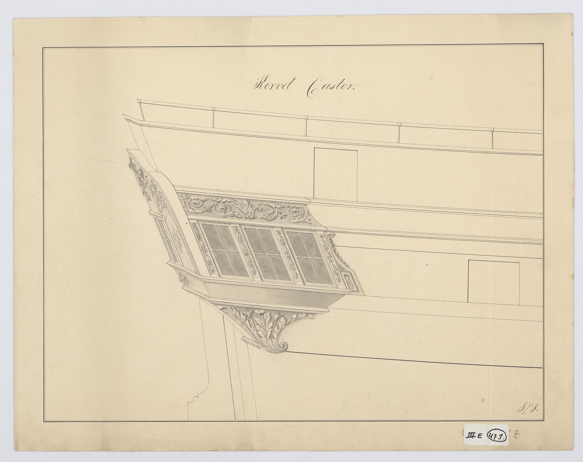 Zijgalerij met drie ramen waarboven arabesken van het korvet Zr.Ms. 'Castor' van 28 stukken.
