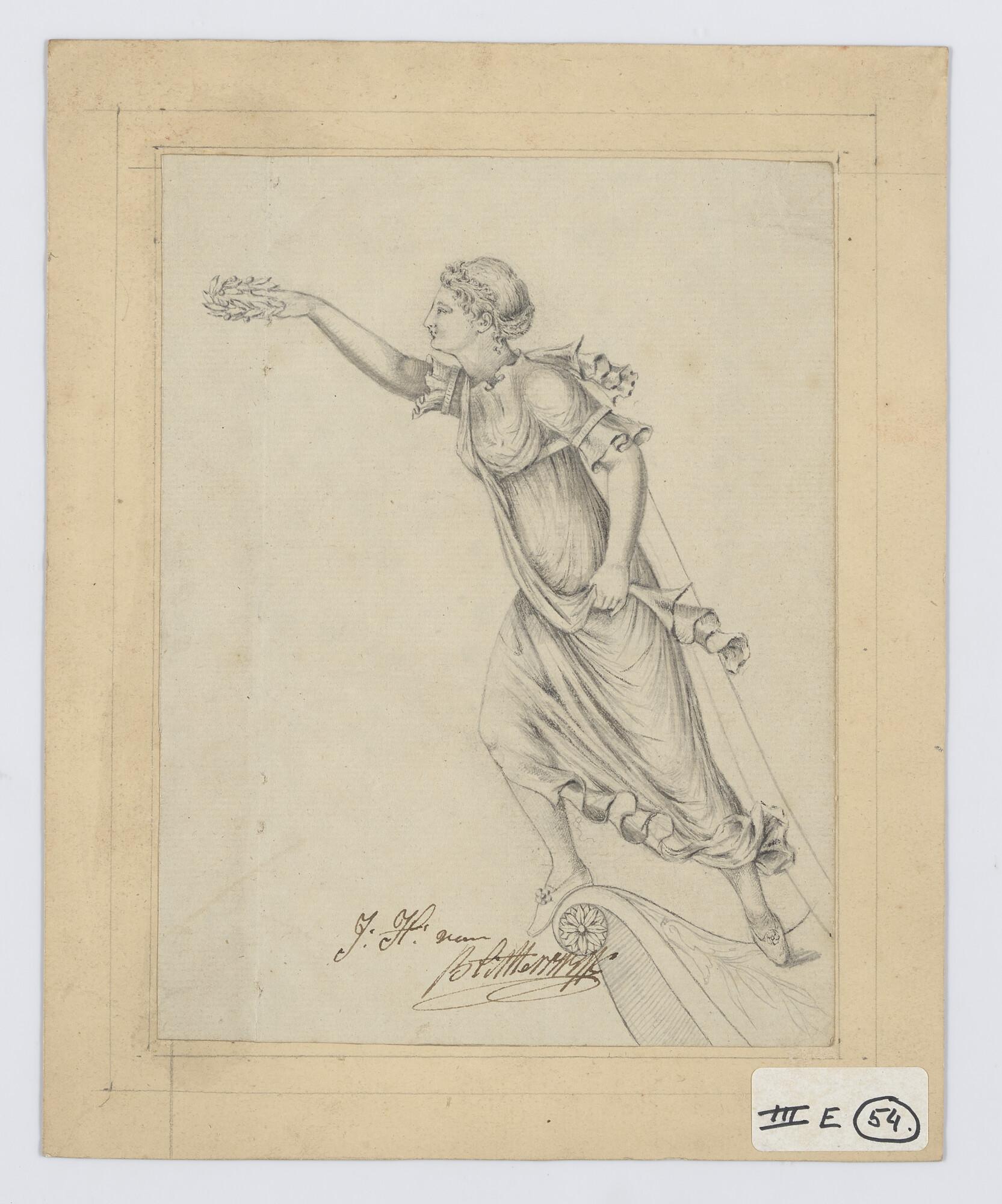 Ontwerp schegbeeld met vrouwfiguur in neo-klassieke jurk.