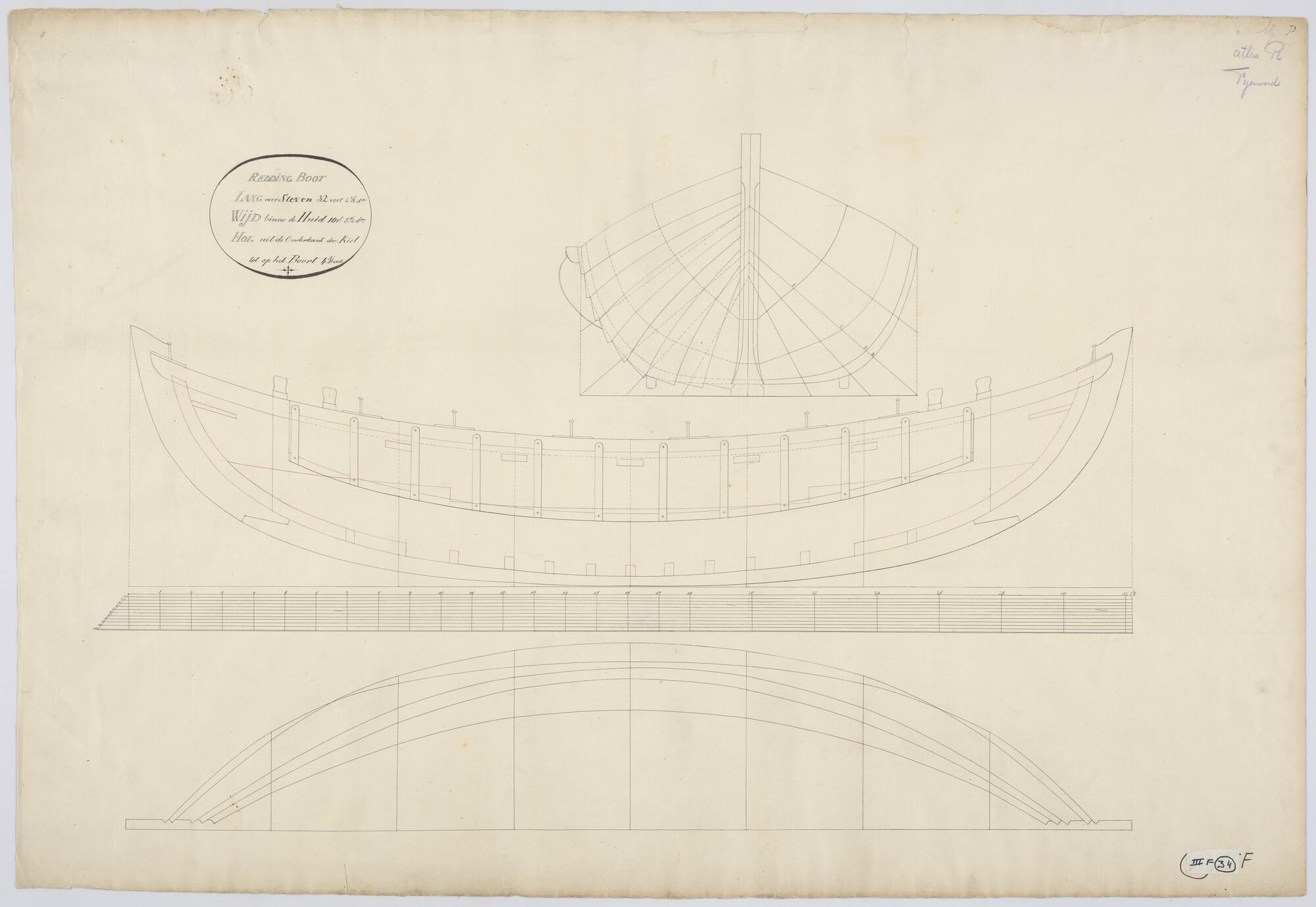 Verticale langsdoorsnede, zijaanzicht, vooraanzicht, bovenaanzicht, dwarsdoorsnede van een Greathead reddingboot. Afmetingen 32.2 3/8 x 10.8½ x 4.8 voet.
