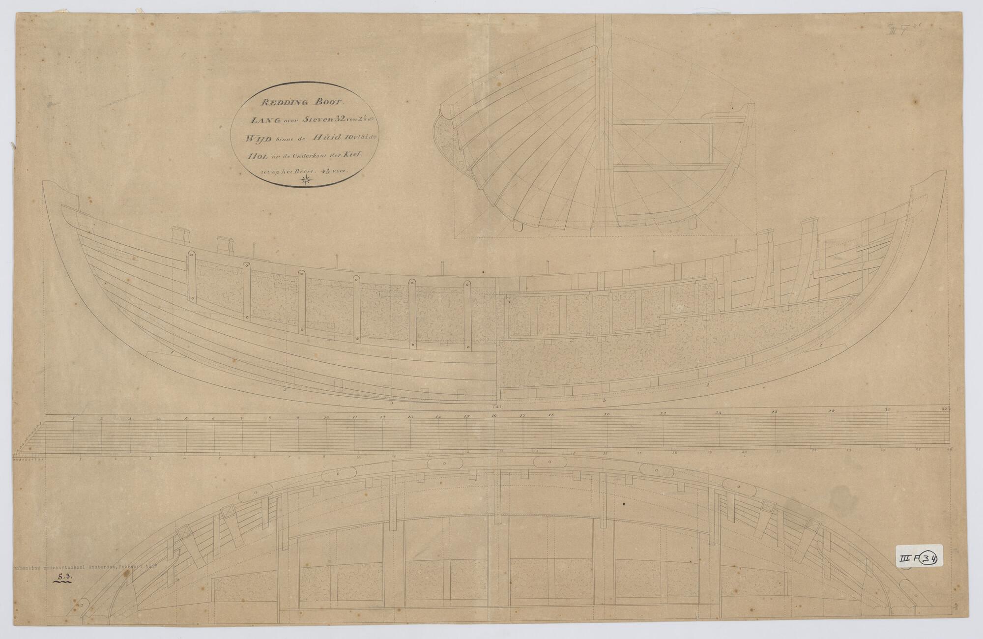 Verticale langsdoorsnede, zijaanzicht, vooraanzicht, bovenaanzicht, dwarsdoorsnede van een Greathead reddingboot. Afmetingen 32.2 3/8 x 10.8½ x 4.8 voet.