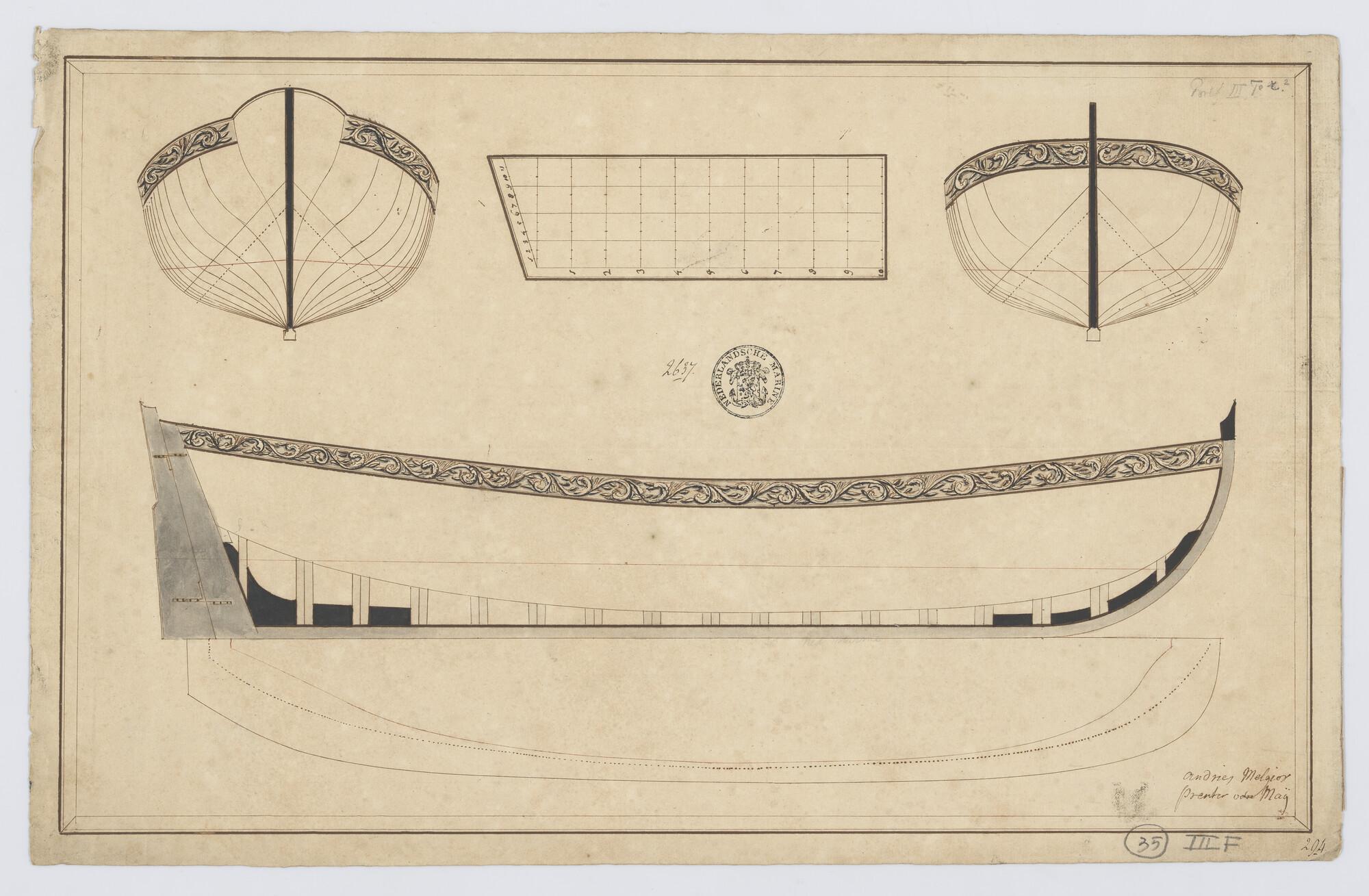 Zijaanzicht, vooraanzicht, achteraanzicht, waterlijnen, senten van een marinesloep met opvallend houtsnijwerk langs de boorden.