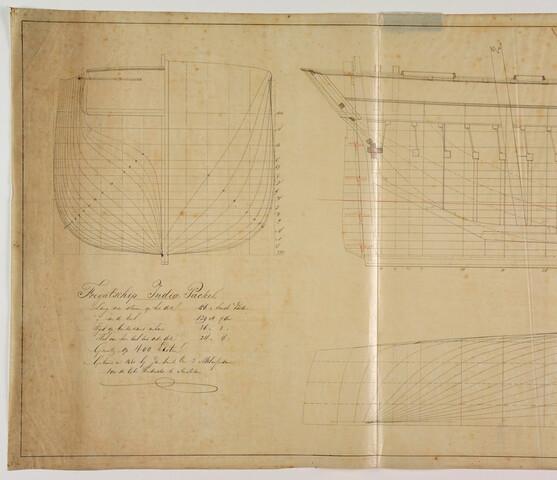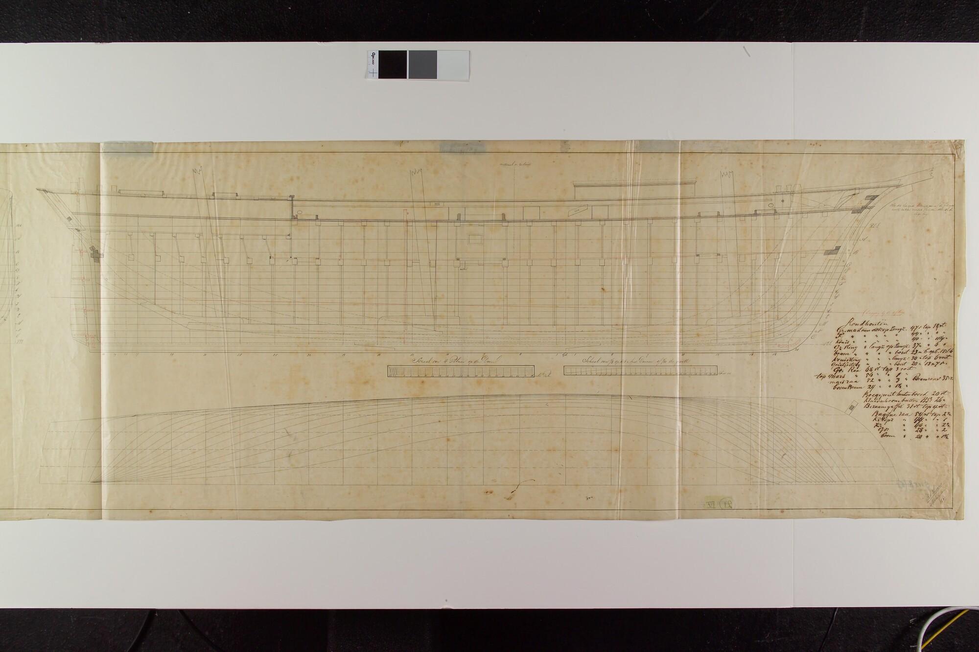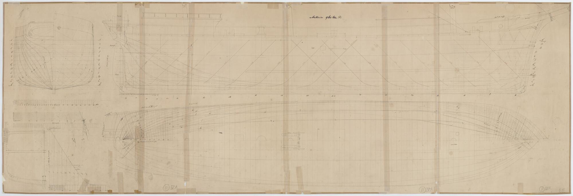 Zij-en bovenaanzicht, spantenraam, senten en waterlijnen van het barkschip 'Antonia', lengte 191.5 voet.