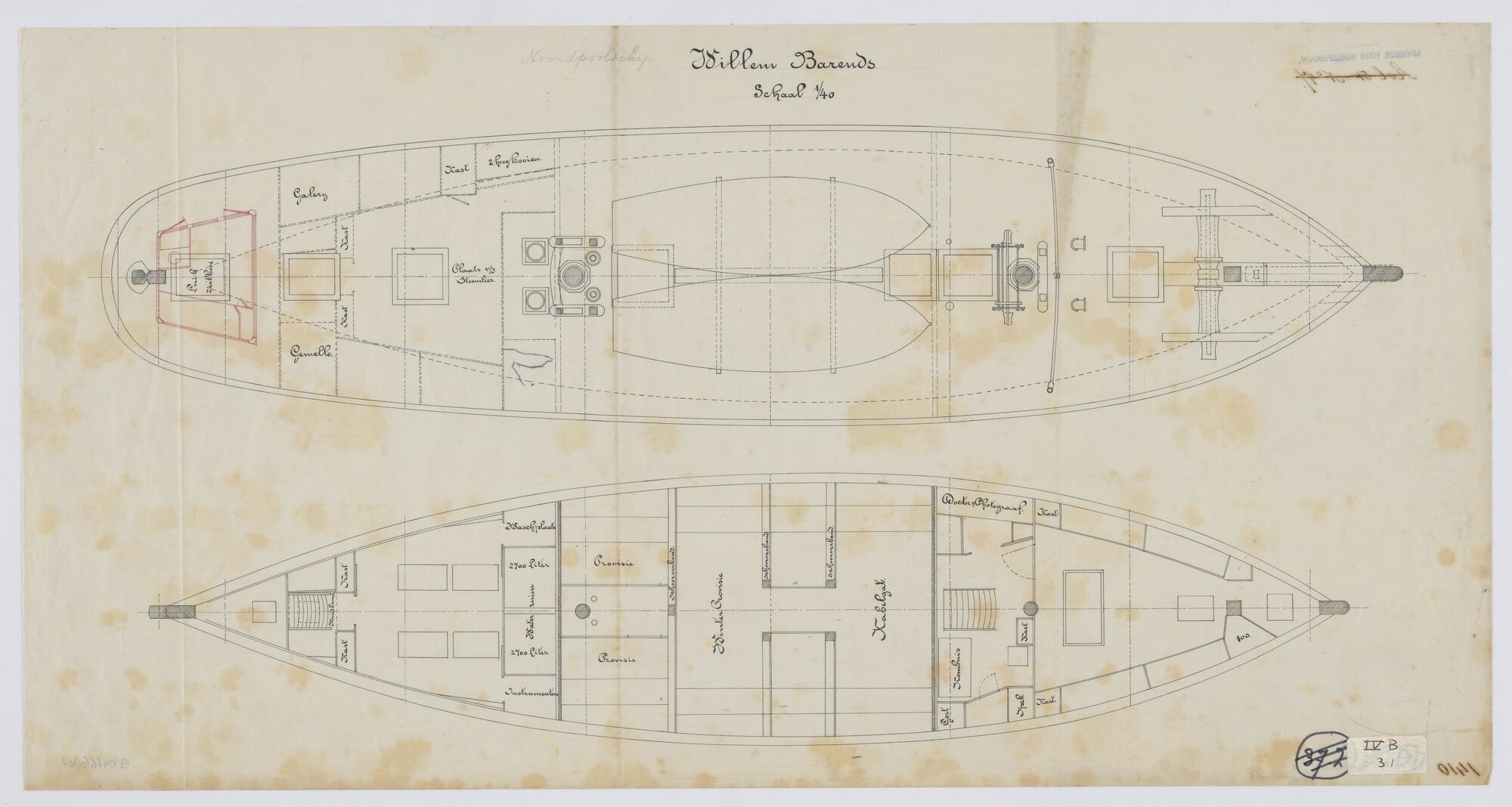 Dekplan en horizontale langsdoorsnede van het ruim of inrichtingsplan van de poolschoener Willem Barents. Schaal 1:40 (vermeld op object).