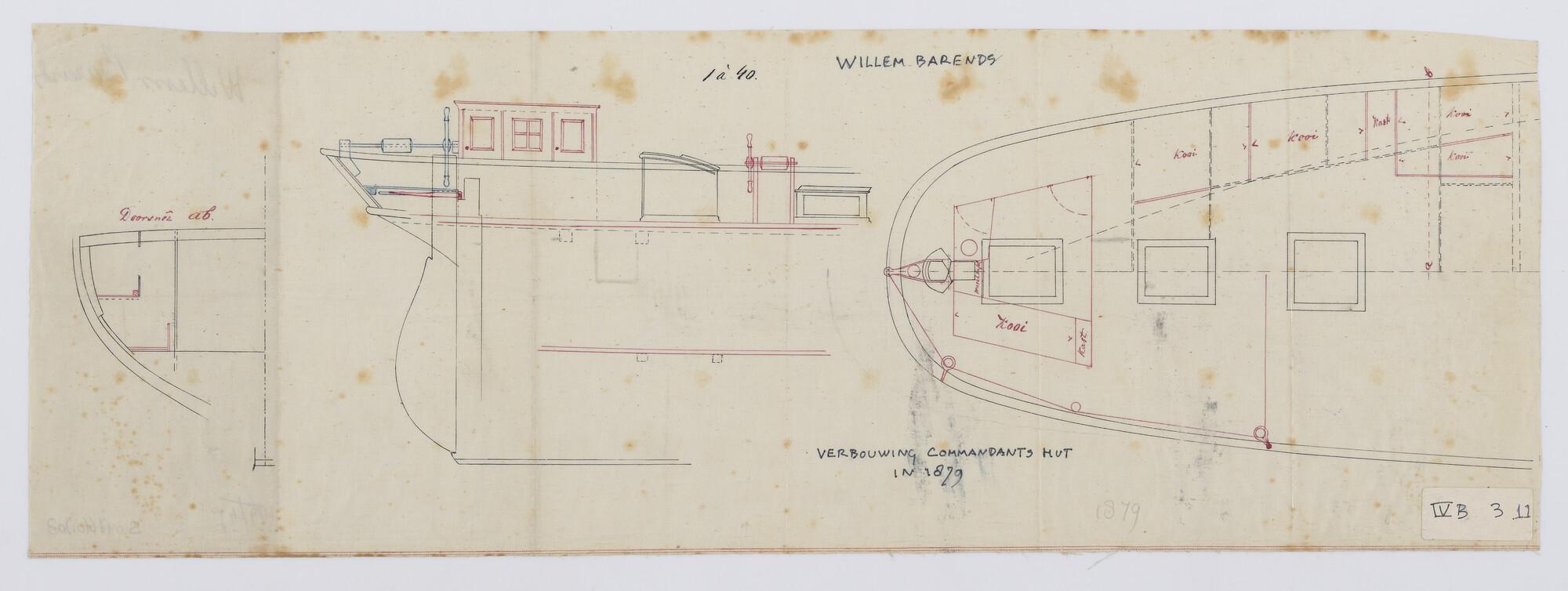 Zij- en bovenaanzicht van de verbouwding van de commandantshut in 1789 van de poolschoener Willem Barents. Schaal 1:40 (vermeld op object).