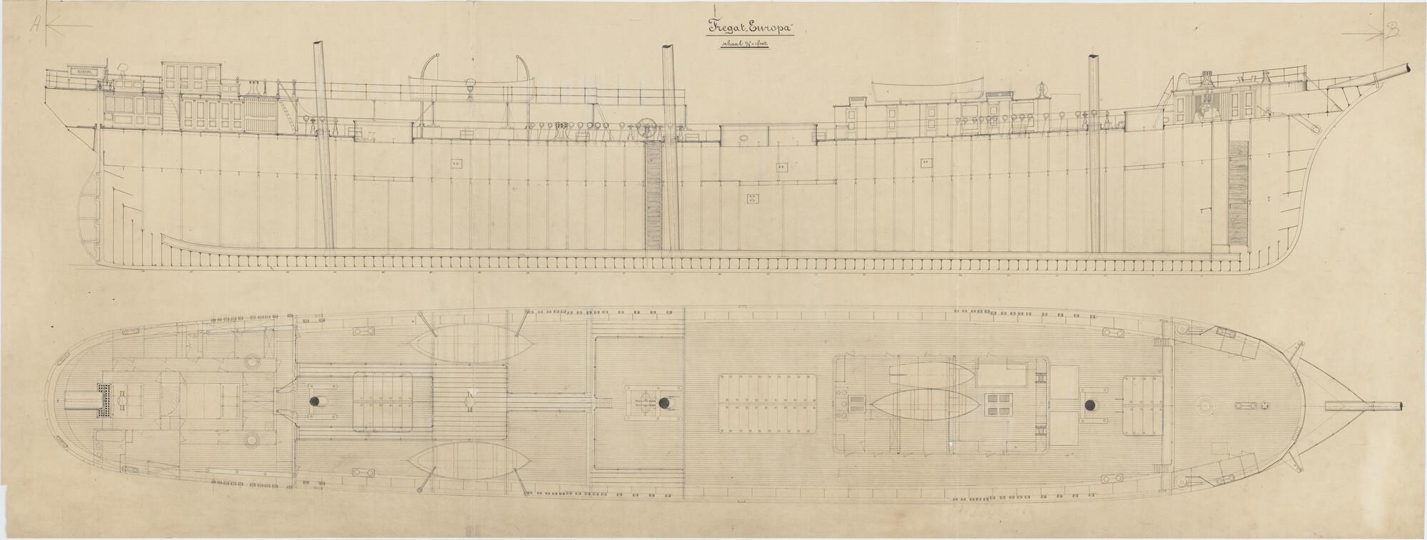 Verticale langsdoorsnede, en bovendek van het stalen fregatschip 'Europa'