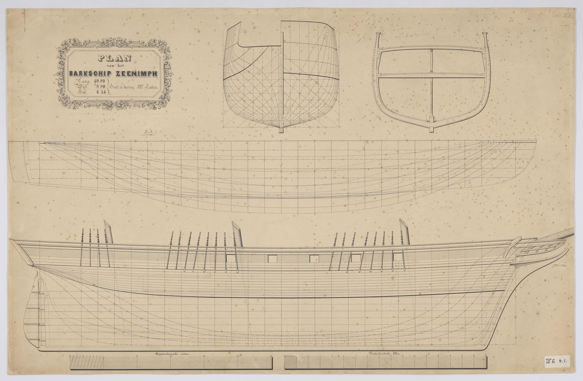 Zijaanzicht, SR, waterlijnen, senten, verticalen, grootspant van het barkschip "Zeenimph" 1854 40.80 x 9.80 x 6.54 el. Tuigtekening in zijaanzicht met zeilplan.