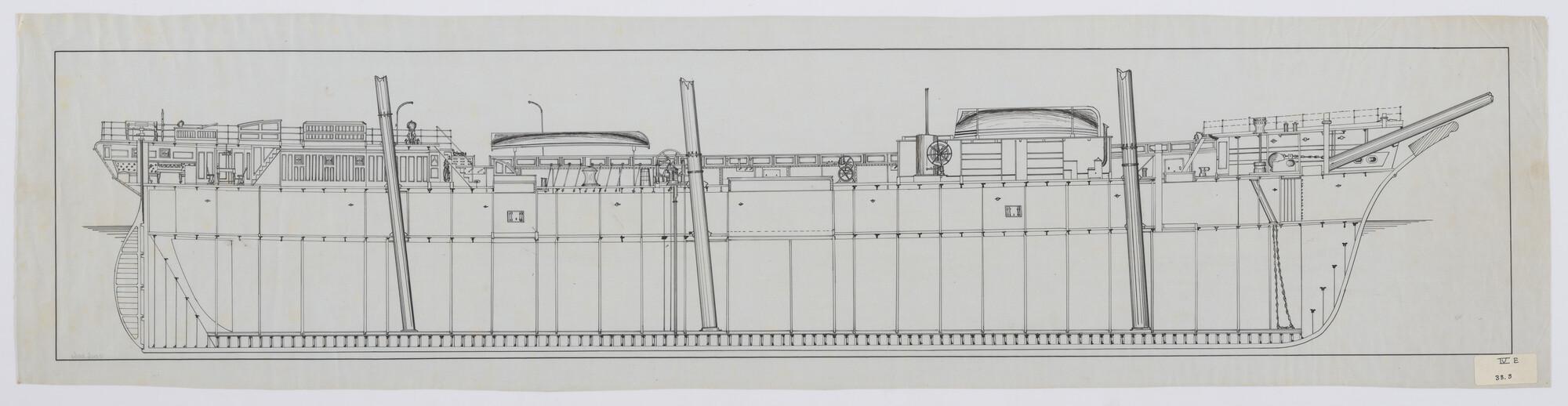 Zijaanzicht, verticale langsdoorsnede, met tuig (driemast volschip) clipper.