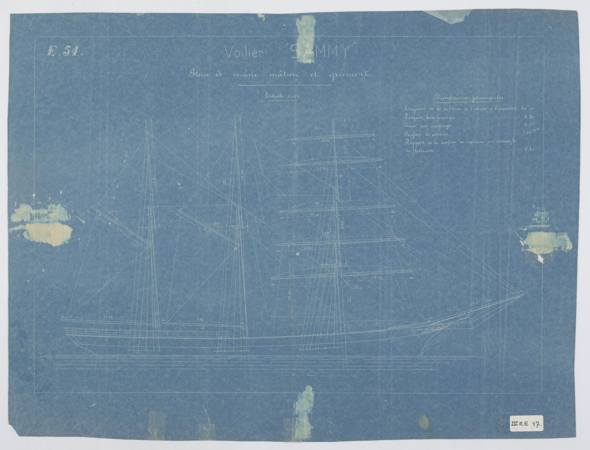 Verticale langsdoorsnede, indeling dekhuizen. Driemastschoenerbrik Sammy. Afmetingen 40 x 8.80 x 21 voet. Tuigplan.