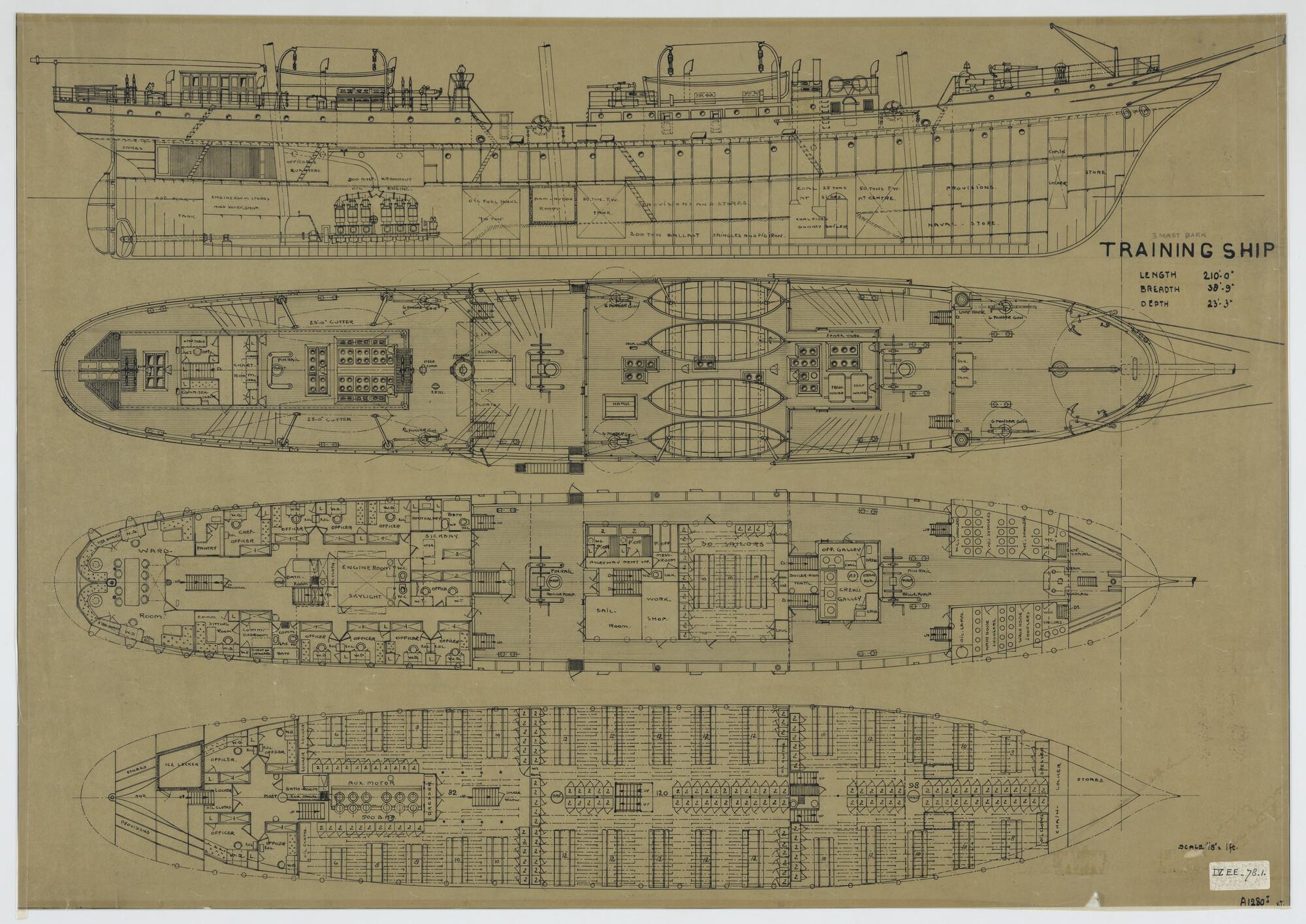 Verticale langsdoorsnede en dekkenplan. Driemast bark (Opleidingsschip).
