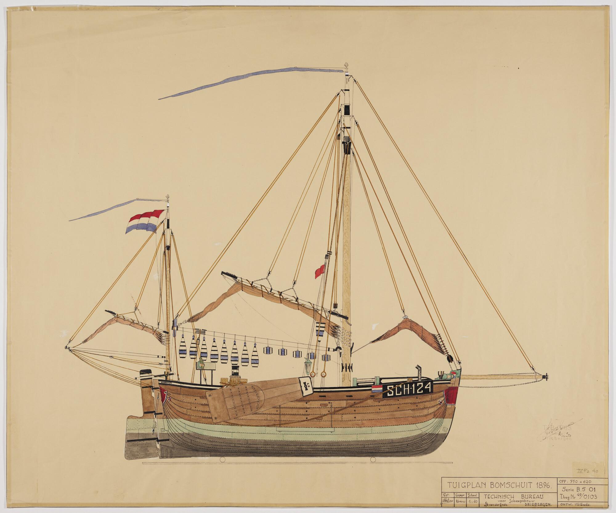 Reconstructietekening van Scheveningse bomschuit SCH 124 (1896): zijaanzicht met tuigplan. Zeilen opgebonden.