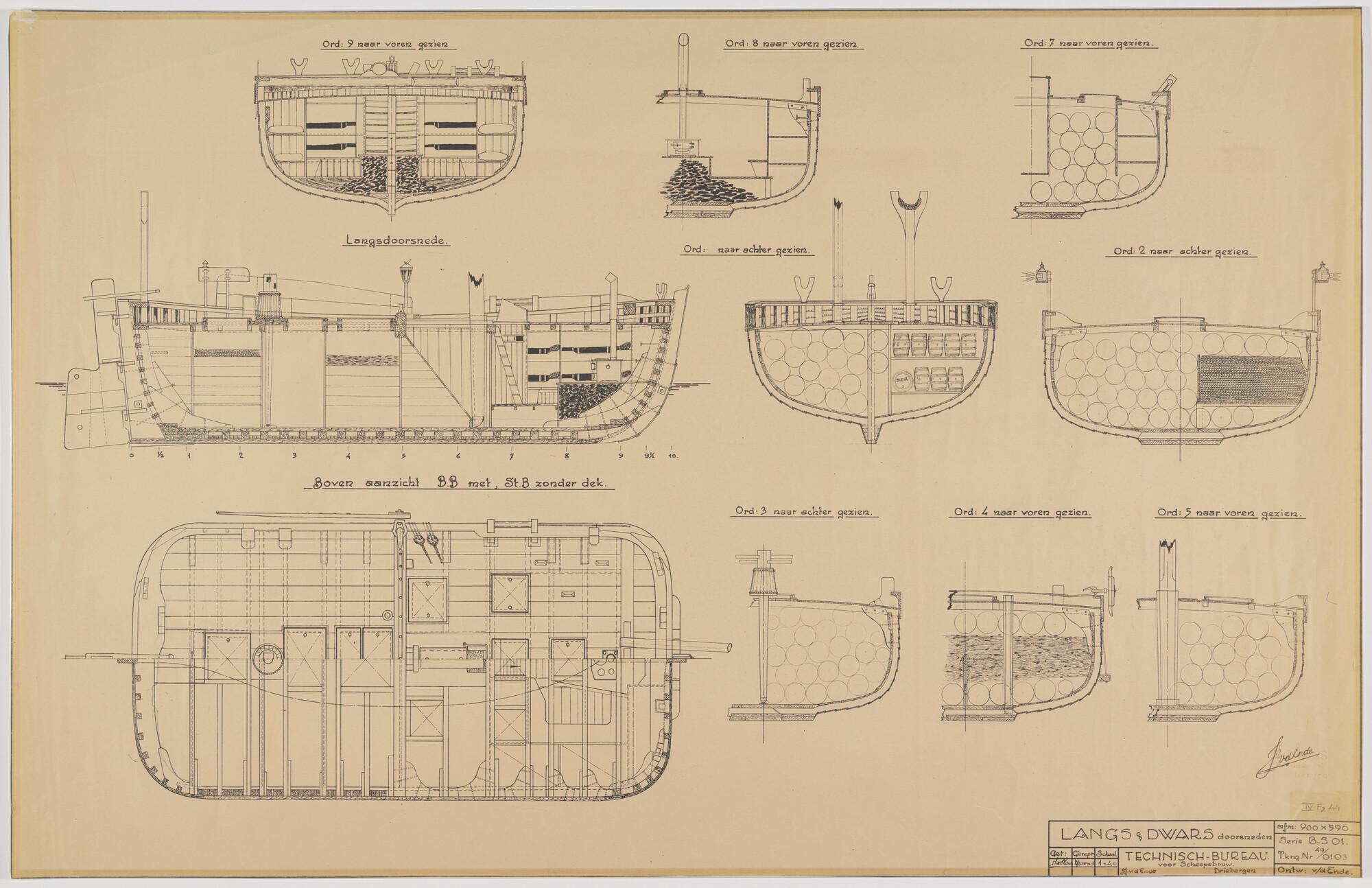 Reconstructietekening van Scheveningse bomschuit SCH 124 en SCH 328 (1896): verticale langsdoorsnede, dwarsdoorsnede, vooraanzicht, achteraanzicht, zijaanzicht met tuigplan en zeilen opgebonden.