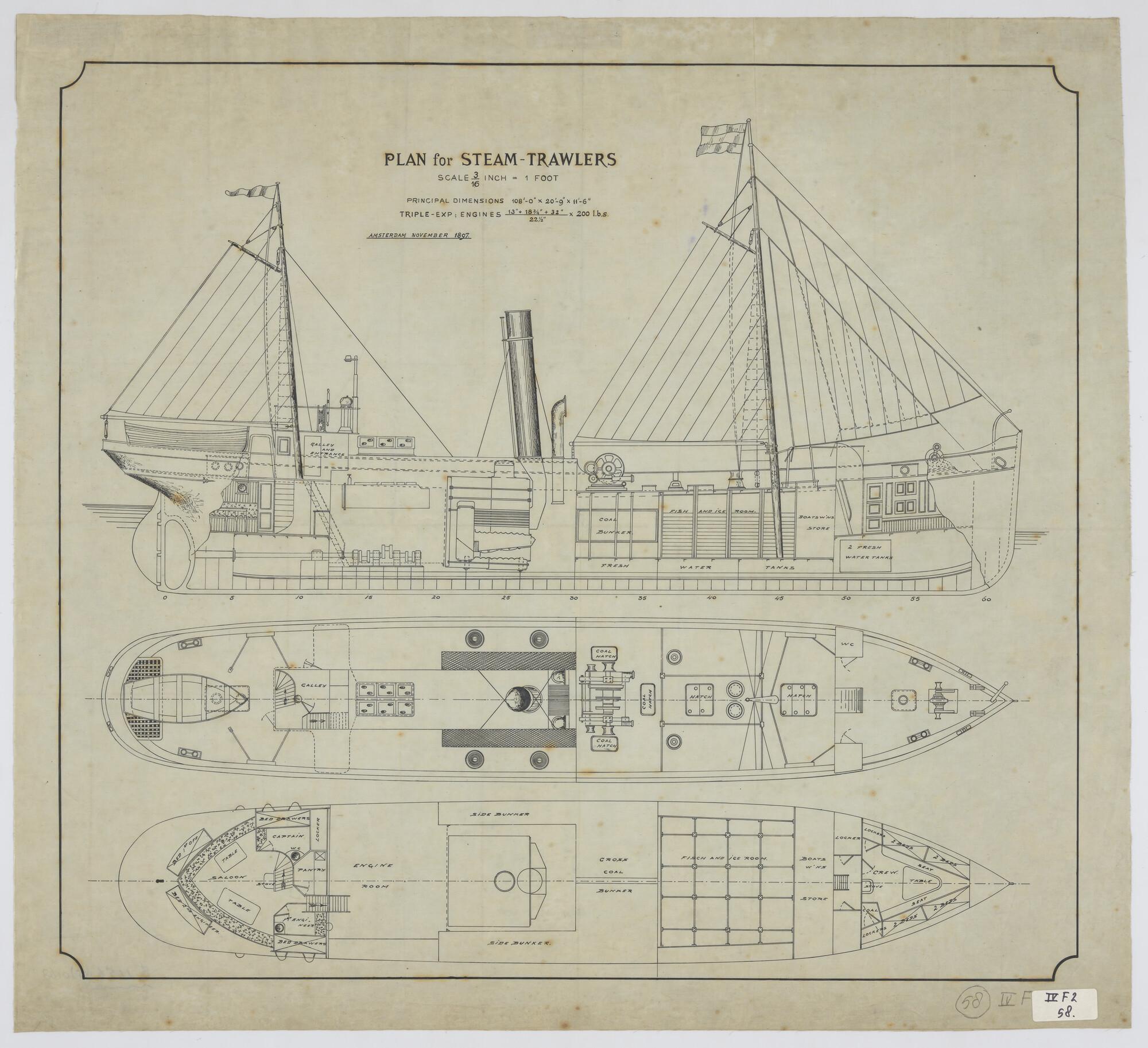 Verticale langsdoorsnede, horizontale langsdoorsnede, bovenaanzicht, Stoomtrawler 1897 108 x 20.9 x 11.6 voet.