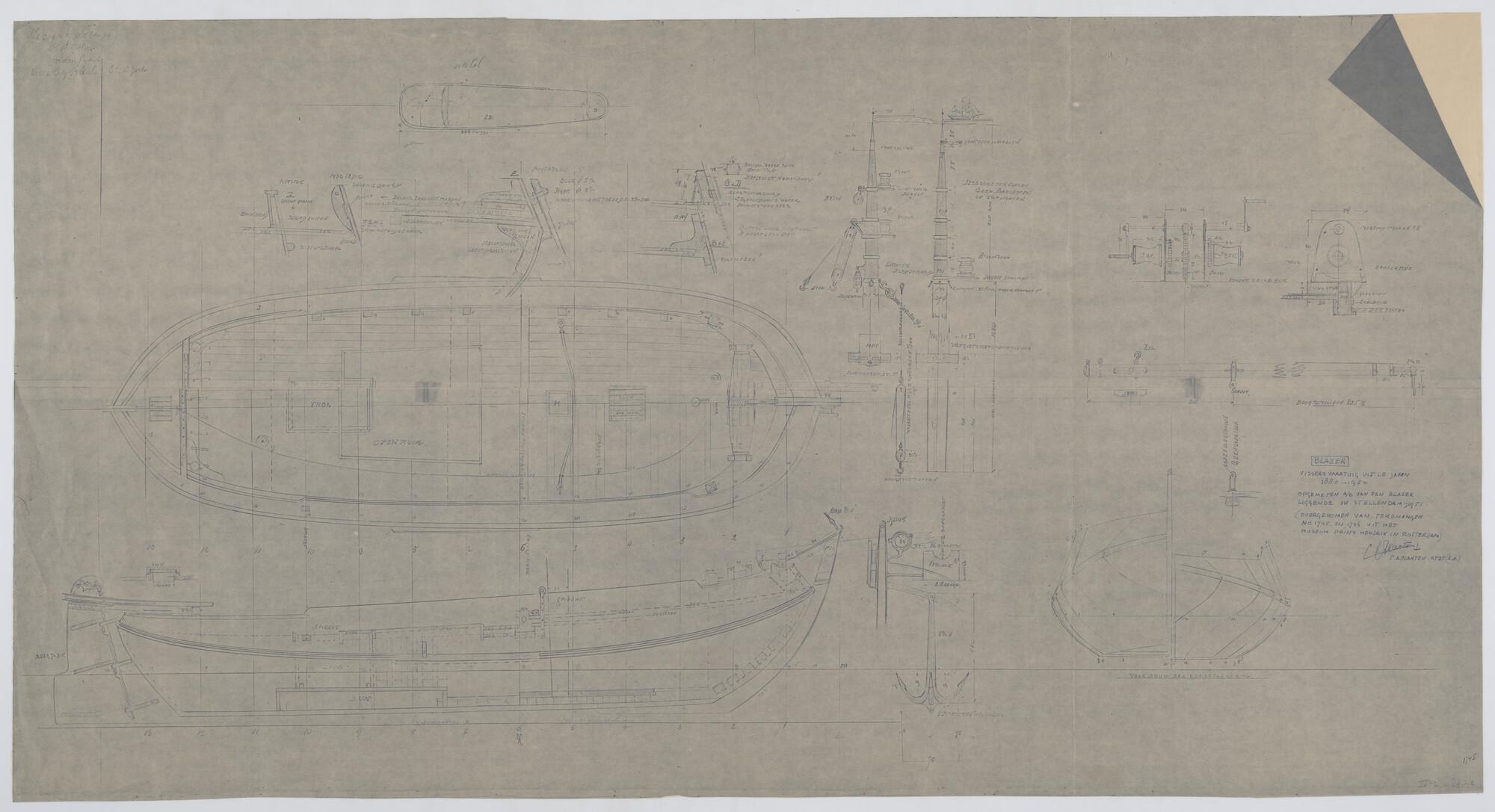Zijaanzicht, bovenaanzicht, vooraanzicht, achteraanzicht, details van zwaarden, mast, boom spil en dreg.