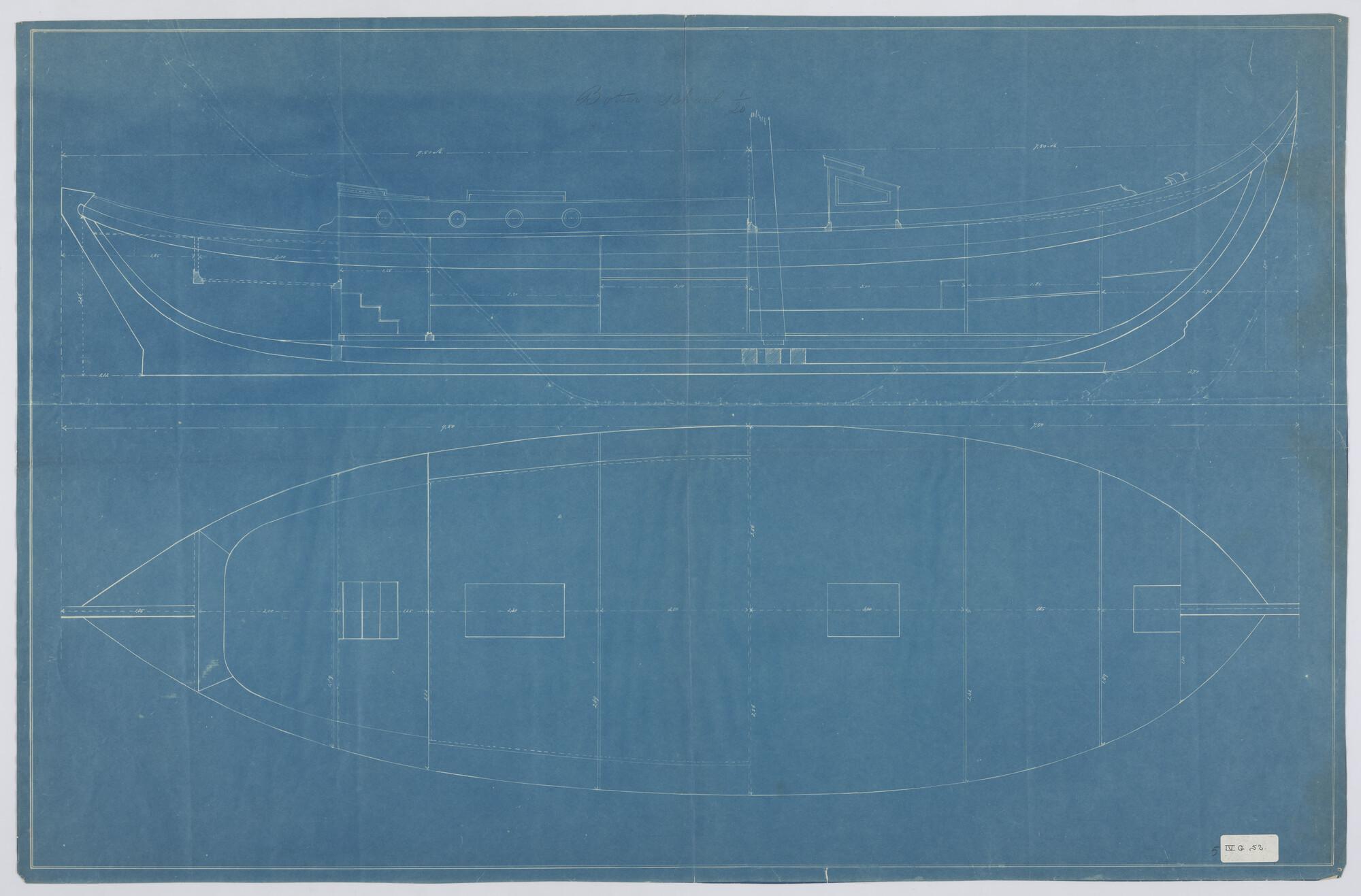 Zijaanzicht, verticale langsdoorsnede en bovenaanzicht van een botterjacht