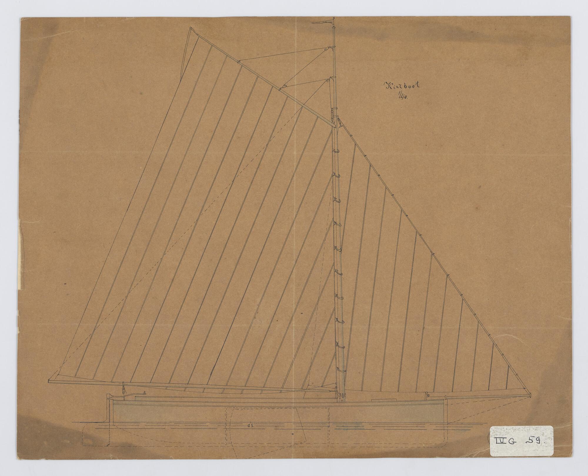Zijaanzicht met tuigplan. Zijaanzicht met midzwaard, bovenaanzicht, spantenraam en waterlijnen van een Amerikaanse kielboot. Afmetingen 8.36 x 3.16.