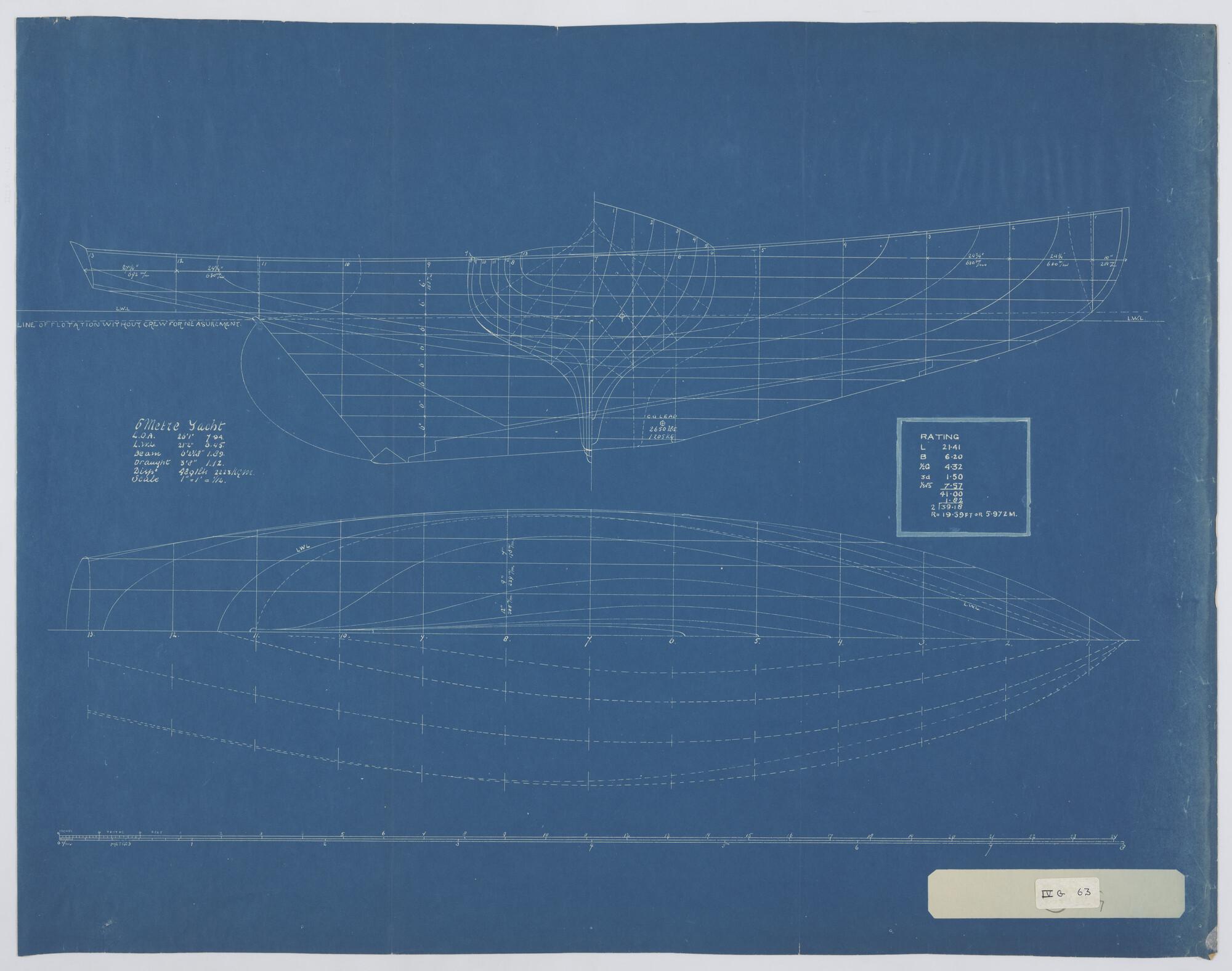 Spantenraam, waterlijnen, senten, verticalen, verticale langsdoorsnede, horizontale langsdoorsnede, bovenaanzicht, grootspant en zijaanzicht met tuigplan van een zes meter jacht.