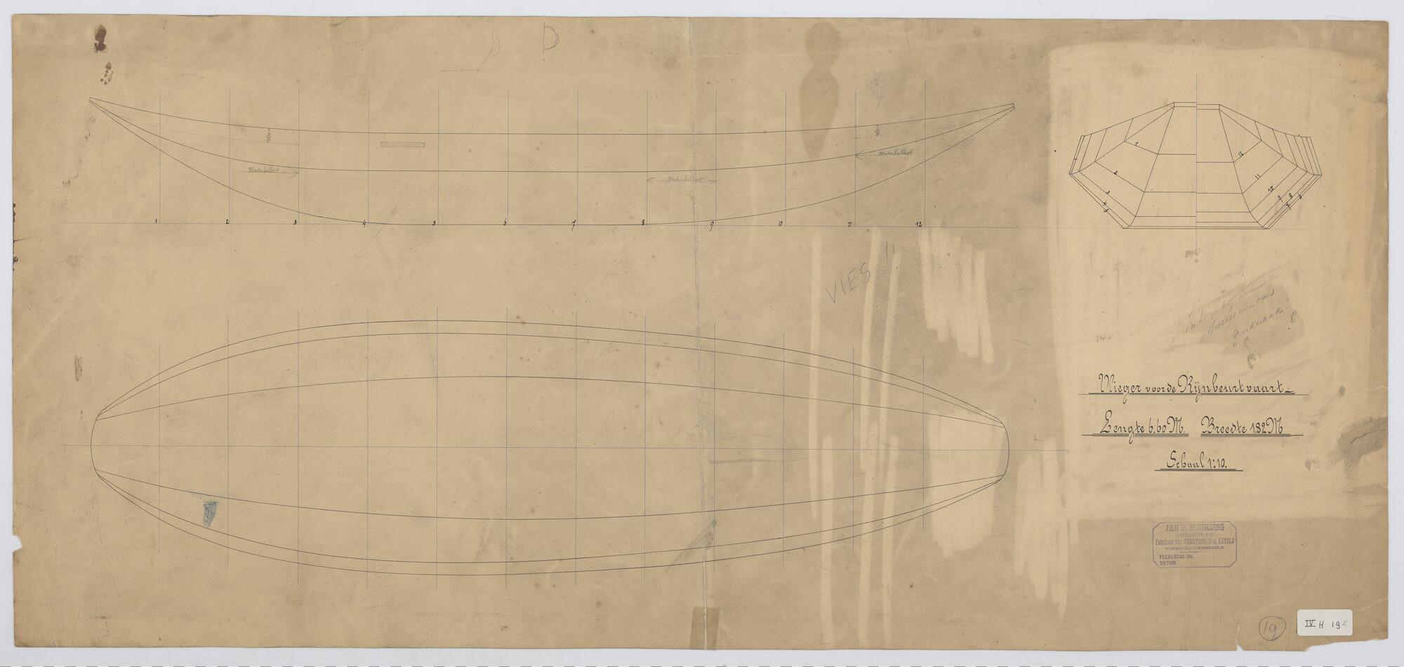 Zijaanzicht, bovenaanzicht, vooraanzicht, achteraanzicht : Vlieger of ankeraak 1882. Afmetingen 6.60 x 1.90.