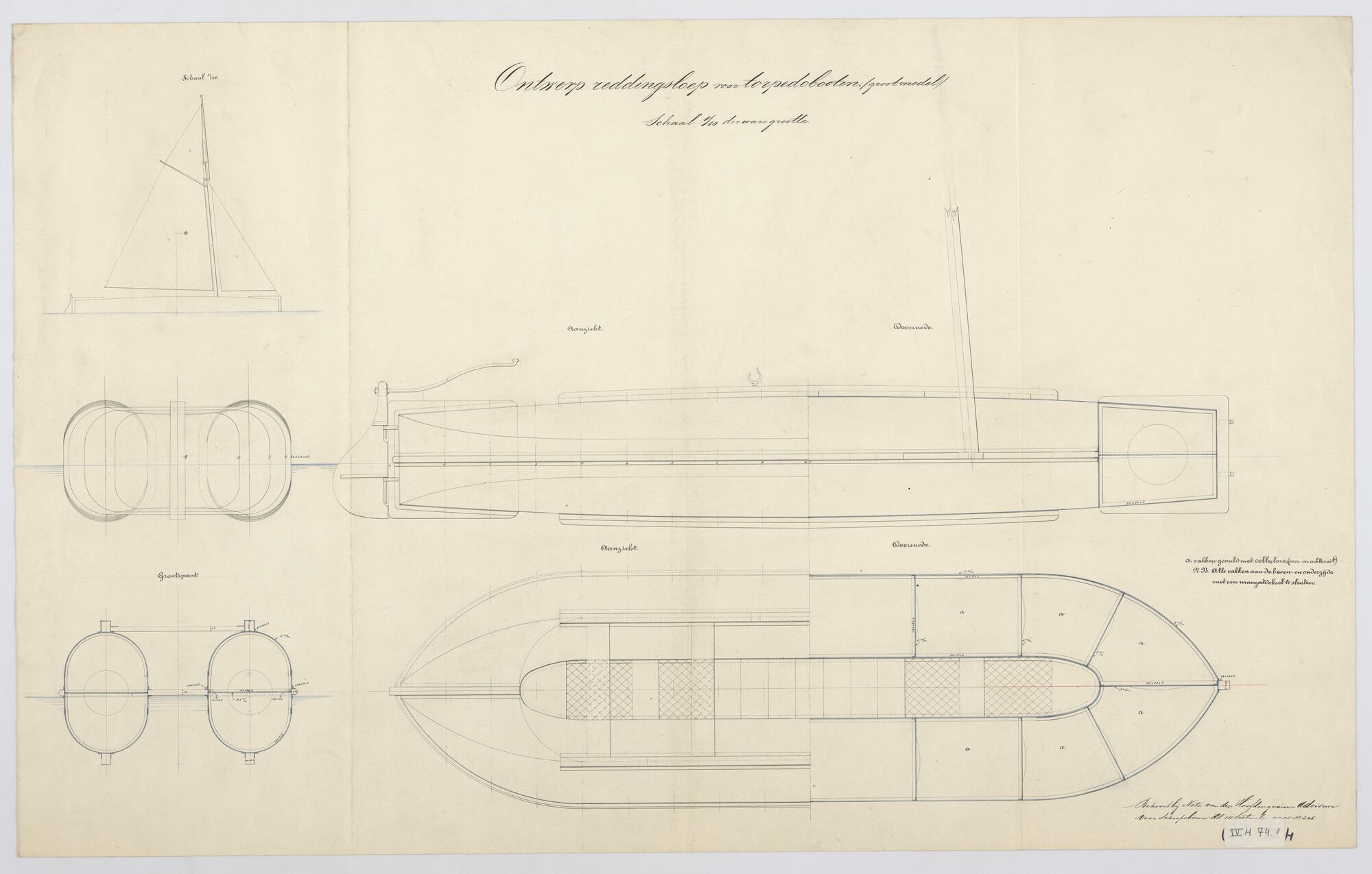 Verticale langsdoorsnede, horizontale langsdoorsnede en dwarsdoorsnede van een reddingsboot voor torpedoboten, 1885, 4.50 x 1.38 x 0.70 meter.