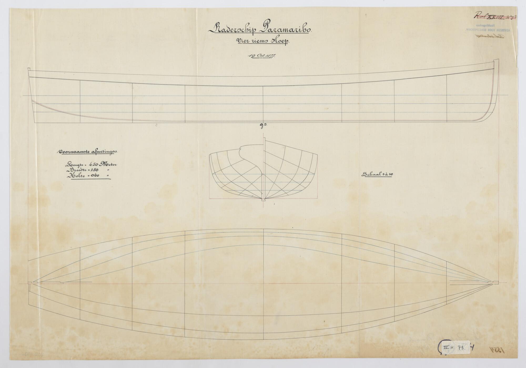 Zijaanzicht, spantenraam, waterlijnen en senten van een Vierriems sloep. 1877, afmetingen 6.50 x 1.50 x 0.60. Behorend bij het raderschip Zr.Ms. Paramaribo.