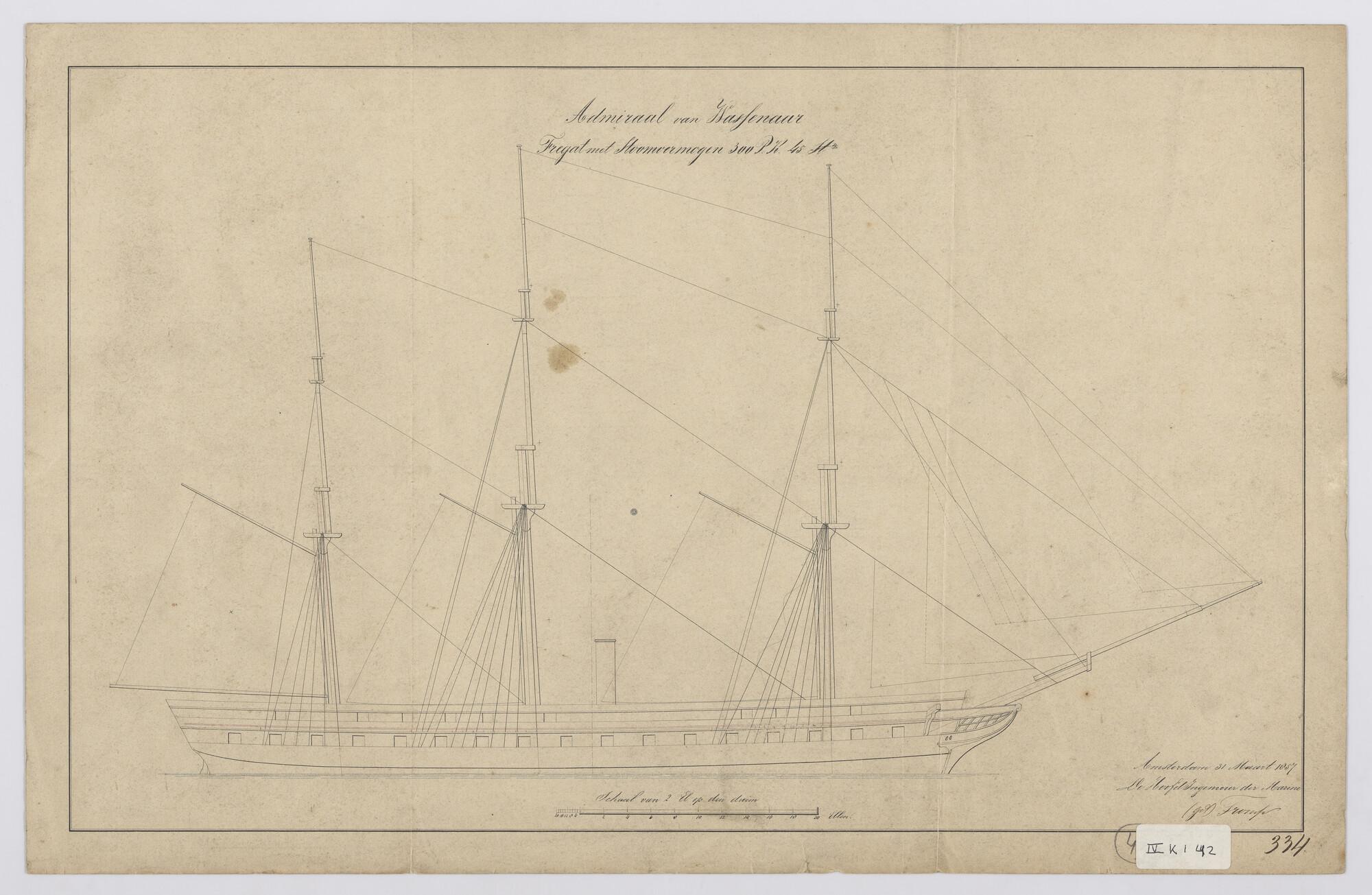 Het fregat eerste klasse met stoomvermogen Zr.Ms. "Admiraal van Wassenaar", 1852. zijaanzicht, en tuigplan 1876 en 1857. (2 tekeningen).