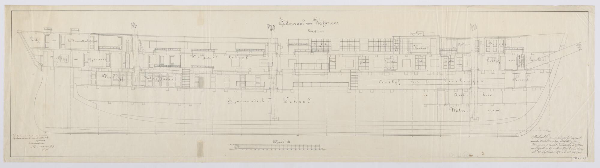 Het fregat eerste klasse met stoomvermogen Zr.Ms. "Admiraal van Wassenaar", 1852. verticale langsdoorsnede, 1875.