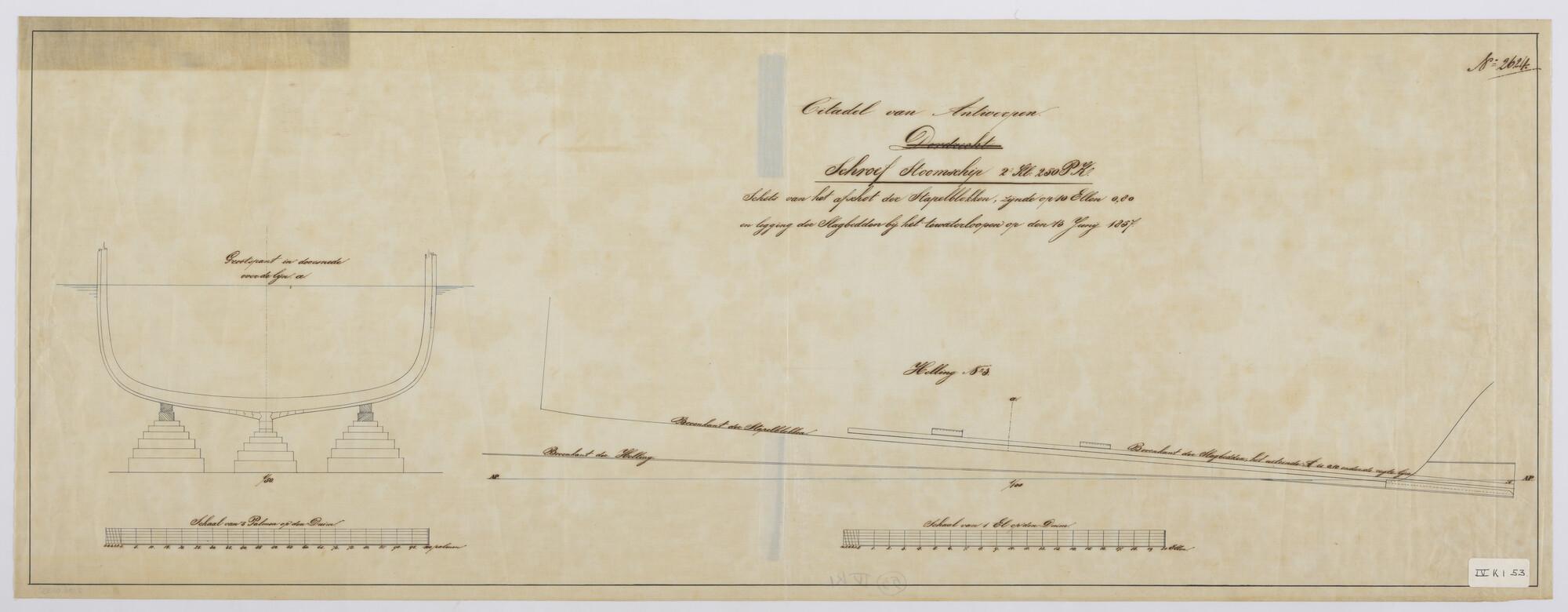 Het schroefstoomschip 2de klasse Zr.Ms. "Citadel van Antwerpen", 1856. Schets afschot stapelblokken bij tewaterlaten, 13 Juni 1857.