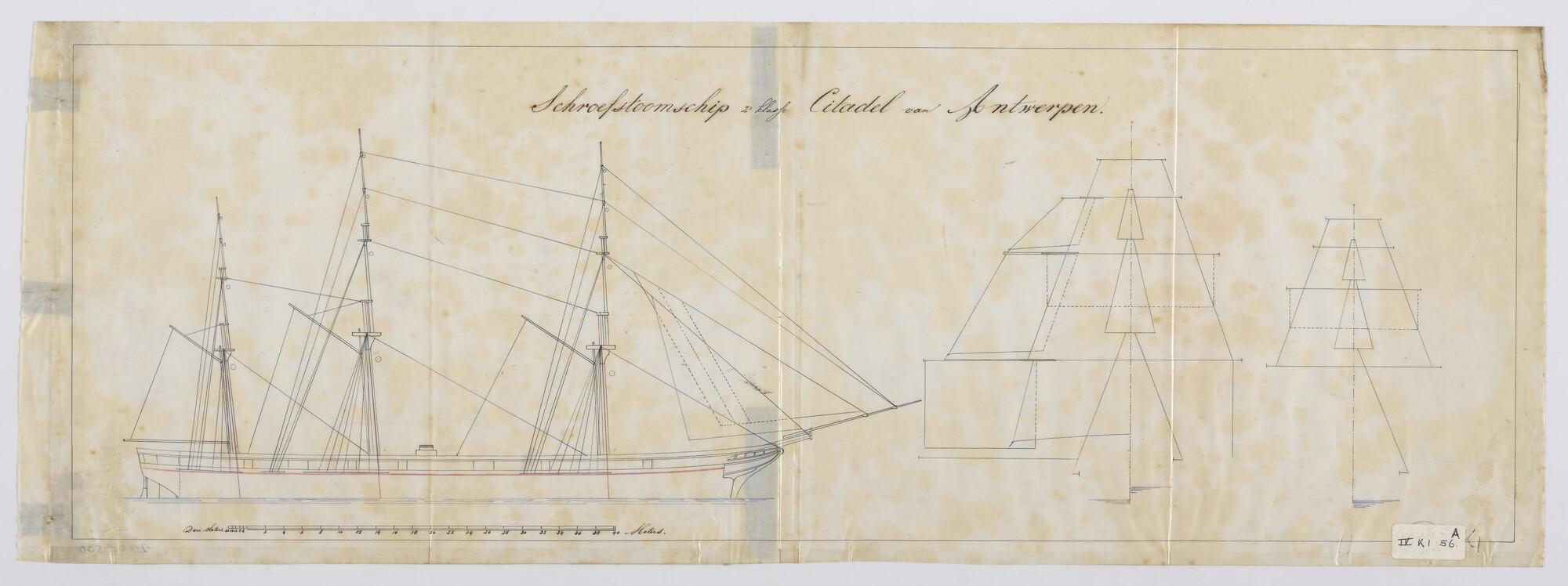 Het schroefstoomschip 2de klasse Zr.Ms. "Citadel van Antwerpen", 1856. Tuigtekening (2 tekeningen). Langs- en dwarsscheeps.
