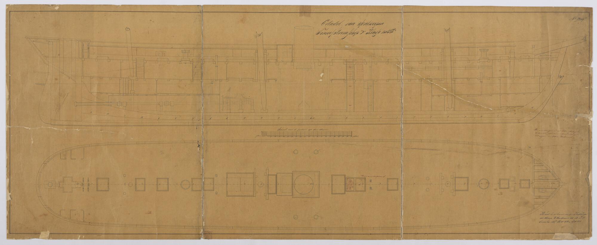 Het schroefstoomschip 2de klasse Zr.Ms. "Citadel van Antwerpen", 1856. verticale langsdoorsnede, bovendek.