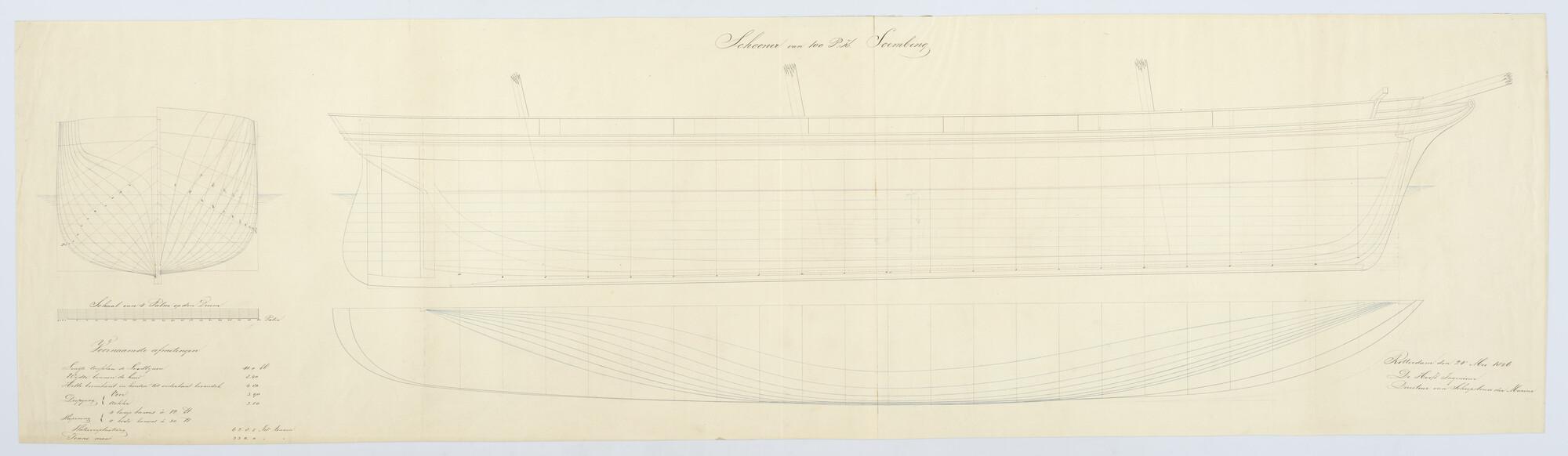 Schroefstoomschip 3de klasse Zr.Ms. "Soembing", 1856. 41 x 8.40 x 4.80 ellen. zijaanzicht, spantenraam, waterlijnen.