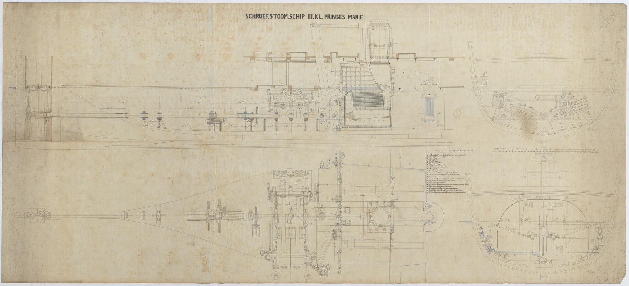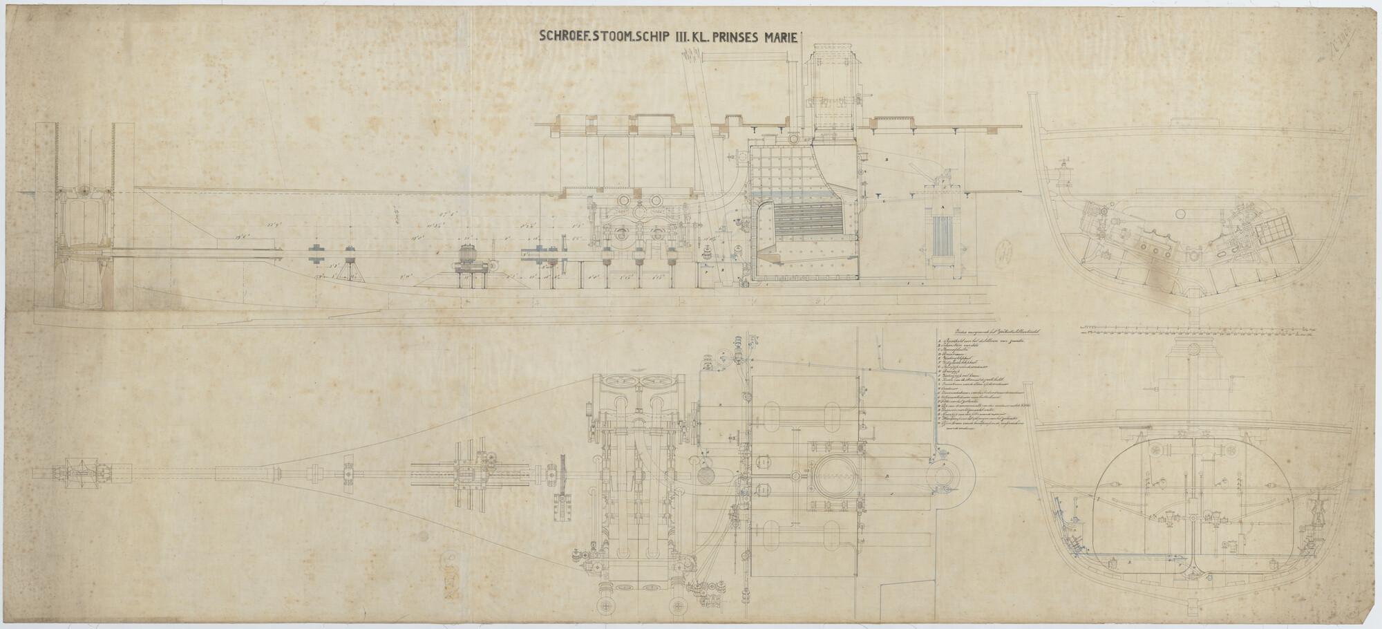 Het schroefstoomschip 3de klasse Zr.Ms. "Prinses Maria", 1858. 46.68 x 9 x 4.80 ellen. zijaanzicht, bovenaanzicht, machinekamer en ketelruim, dwarsscheeps aanzicht van ketels en machines.