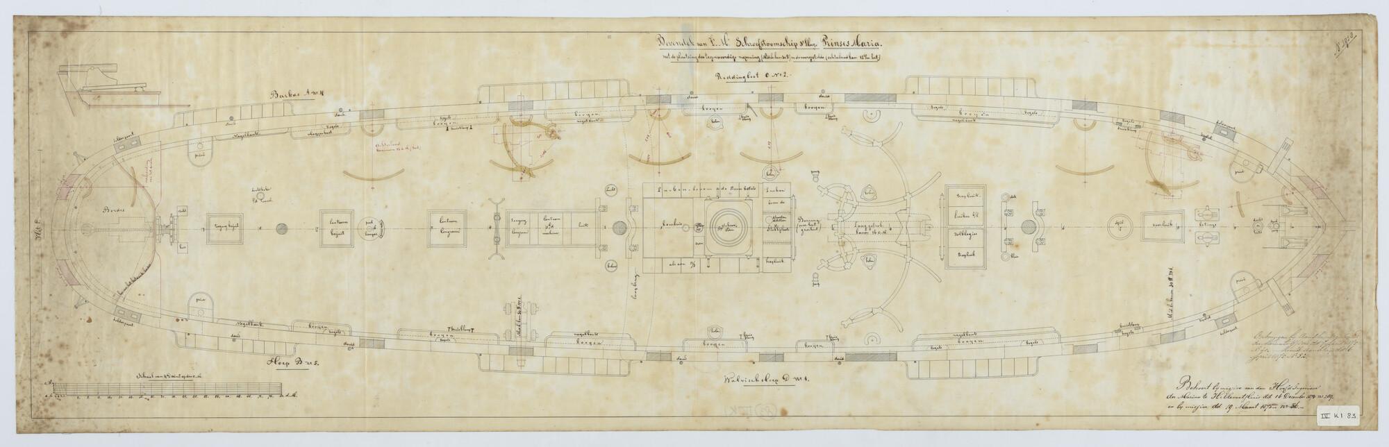 Het schroefstoomschip 3de klasse Zr.Ms. "Prinses Maria", 1858. 46.68 x 9 x 4.80 ellen. Bovendek met bewapening 1874.