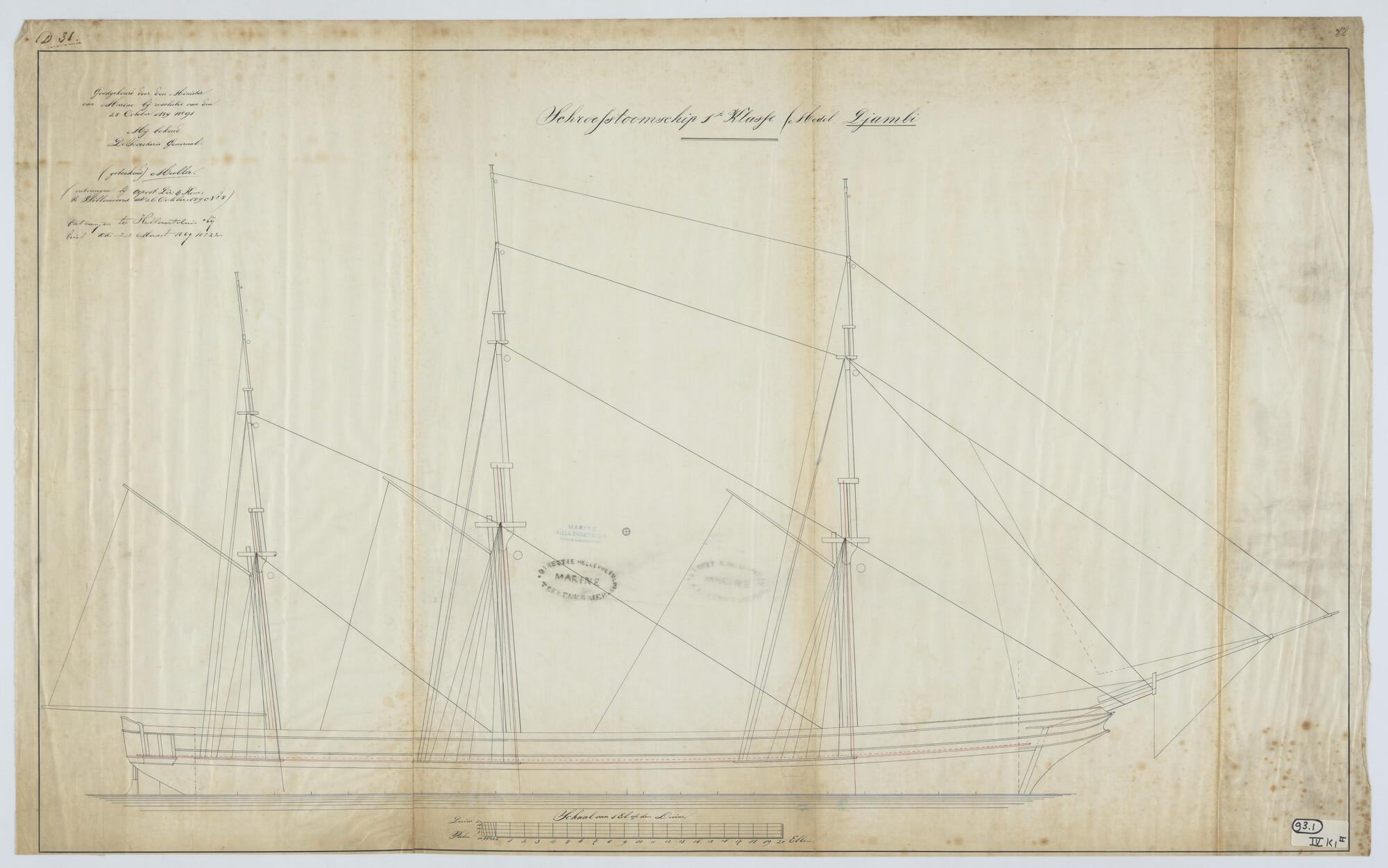 Het schroefstoomschip 1ste klasse Zr.Ms. "Djambi", 1858. Tuigtekening.