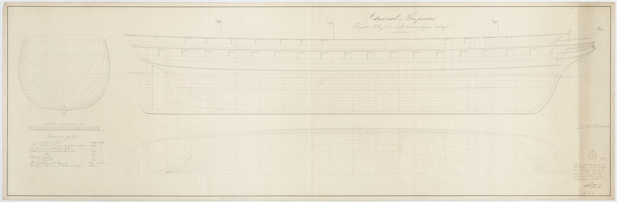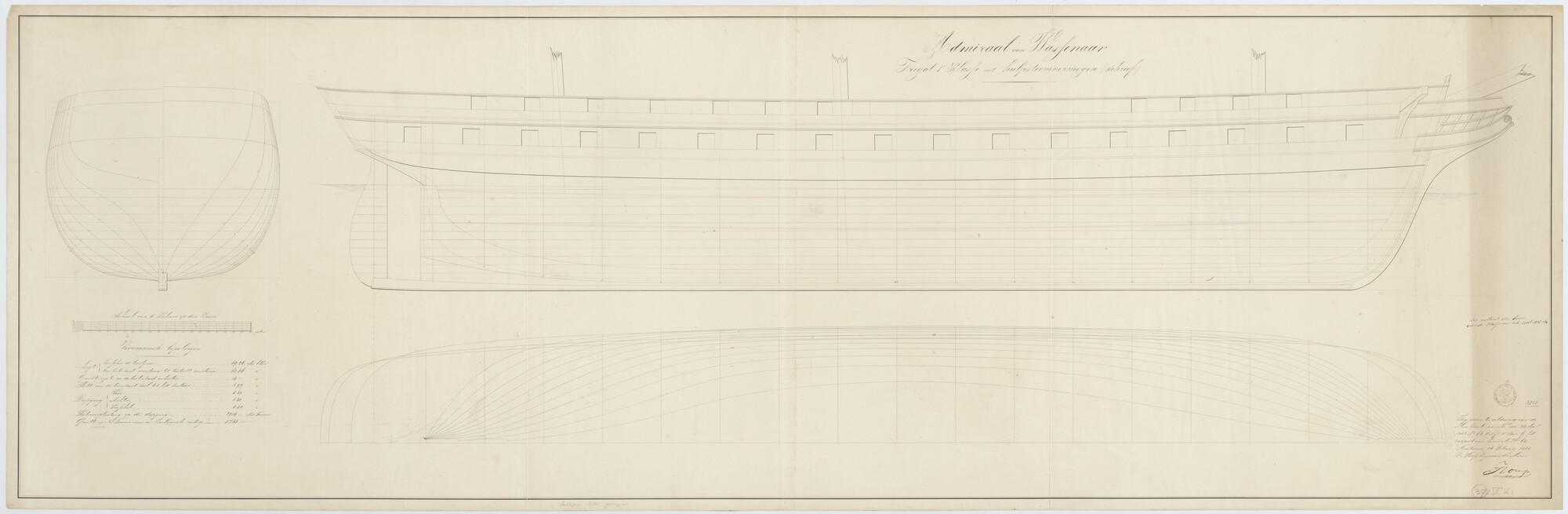 Het fregat eerste klasse met stoomvermogen Zr.Ms. "Admiraal van Wassenaar", 1852. 62.36 x 14 x 6.97 ellen.