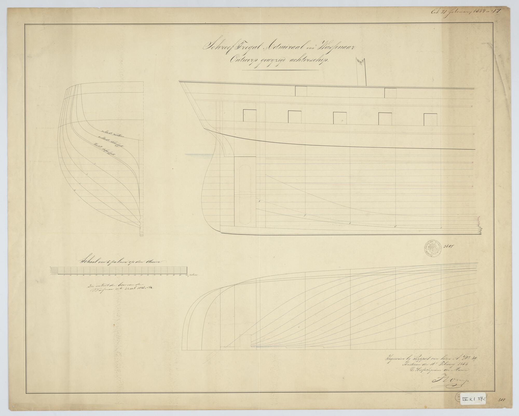 Het fregat eerste klasse met stoomvermogen Zr.Ms. "Admiraal van Wassenaar", 1852. zijaanzicht, spantenraam, waterlijnen achterschip.