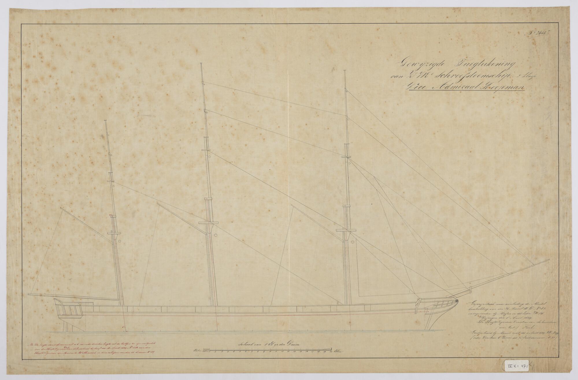 Schroefstoomschip 2de klasse Zr.Ms. "Vice Admiraal Koopman", 1856. 59.5 x 11 x 6.6 ellen. Gewijzigde tuigtekening (1859). 2 tekeningen.