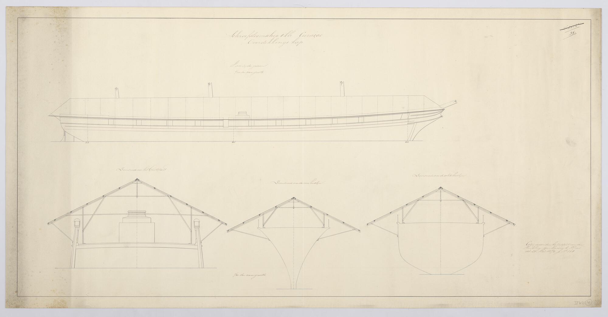 Het schroefstoomschip 1ste klasse Zr.Ms. "Curaçao", 1860. (ex- "Willem"). zijaanzicht, en doorsneden van overdekkingskap 1874.