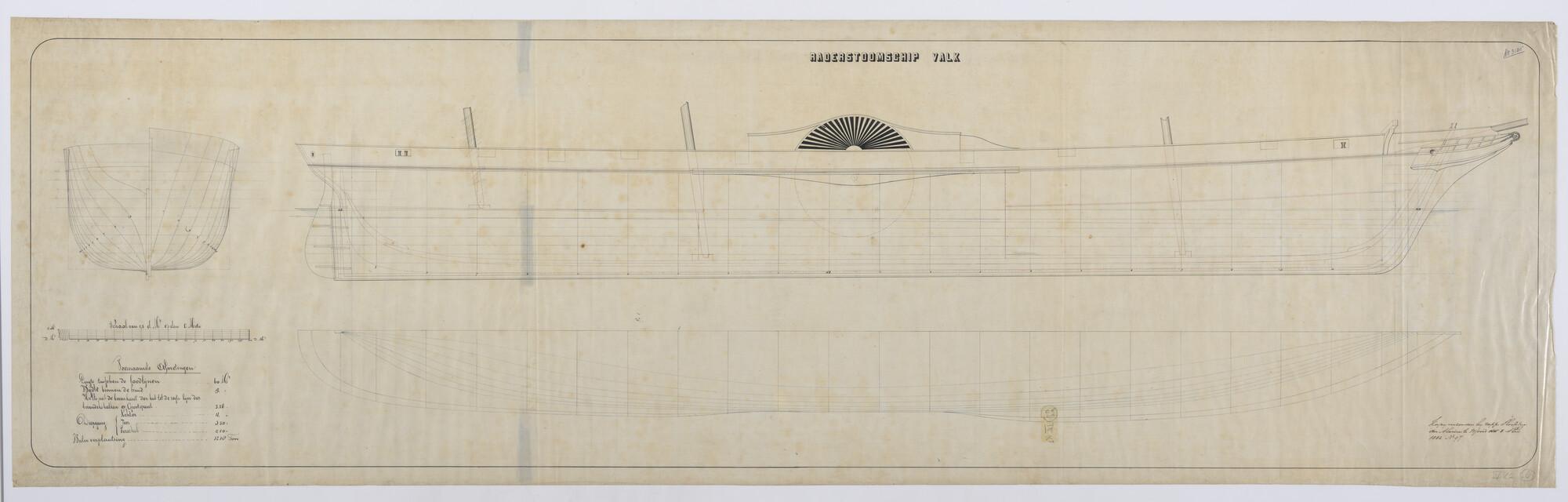 Het raderstoomschip Zr.Ms. Valk, 1863. lijnenplan, met rode wijzigingen 1882.