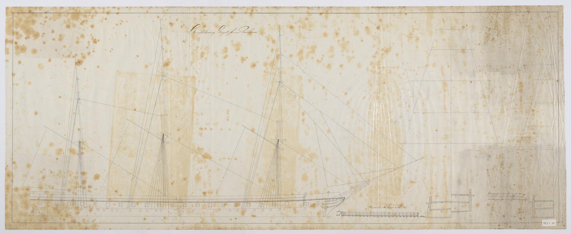 Het fregat met stoomvermogen Zr.Ms. "Anna Paulowna", 1865. Tuigplan met langere masten.
