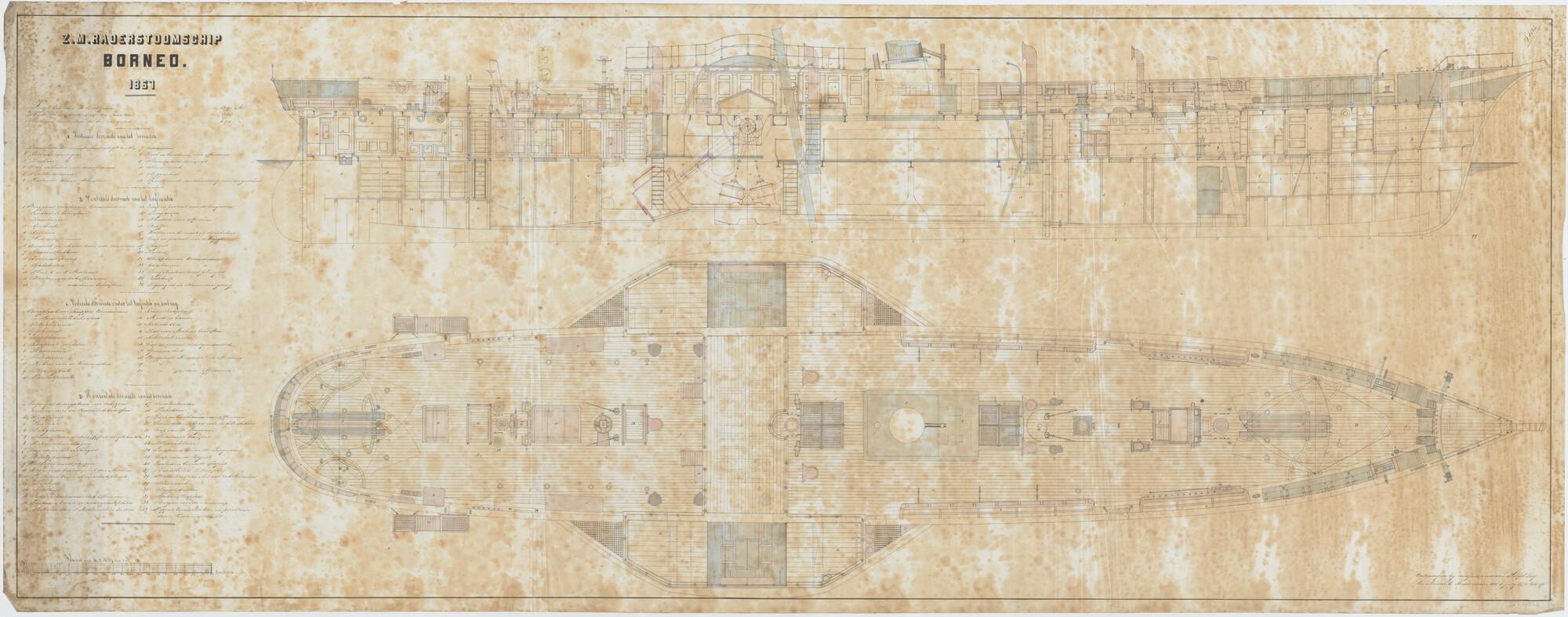 Het raderstoomschip Zr.Ms. "Borneo", 1866. verticale langsdoorsnede, Bovendek, Bestek.
