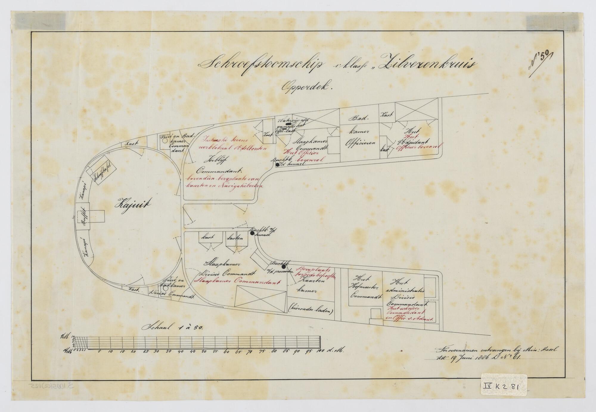 Schroefstoomschip 1ste klasse Zr.Ms. "Zilveren Kruis", 1867. Indeling onder kampagnedek, met voorstellen in rood 1886.