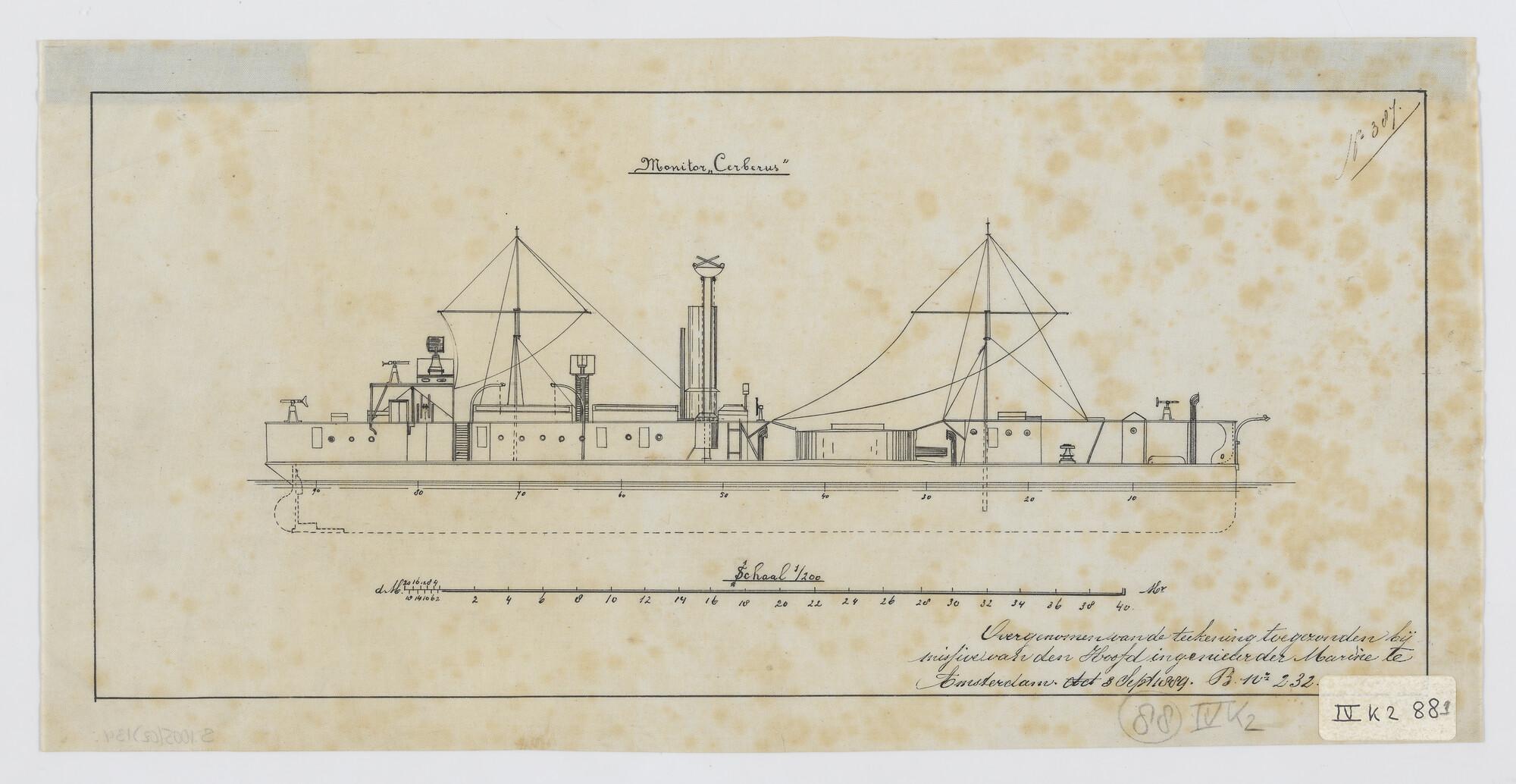 De monitor Zr.Ms. "Cerberus", 1867. 54.80 x 13.40 x 3.50 meter. Indeling tussendek met zijaanzicht.