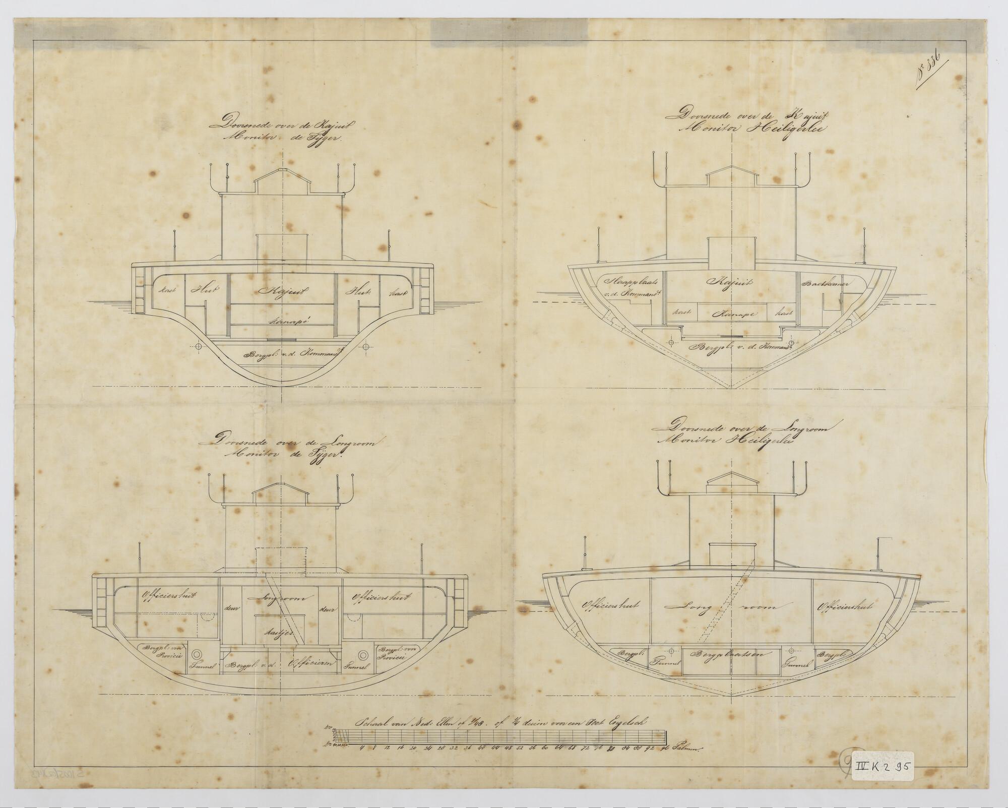 De monitor Zr.Ms. "Tijger", 1867. 187 x 44 x 11 voet. dwarsdoorsnede over kajuit en longroom van Tijger en Heiligerlee.