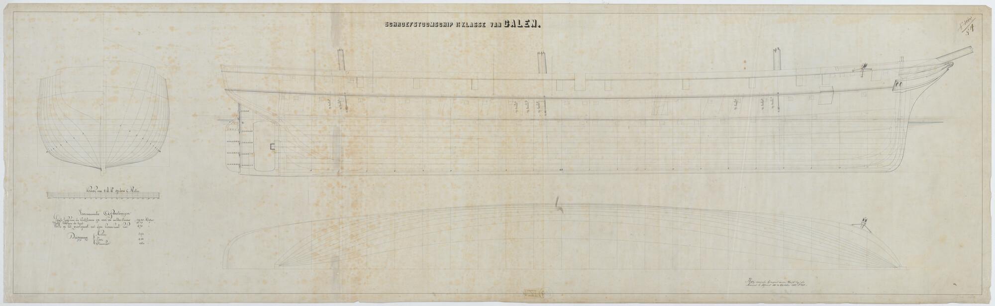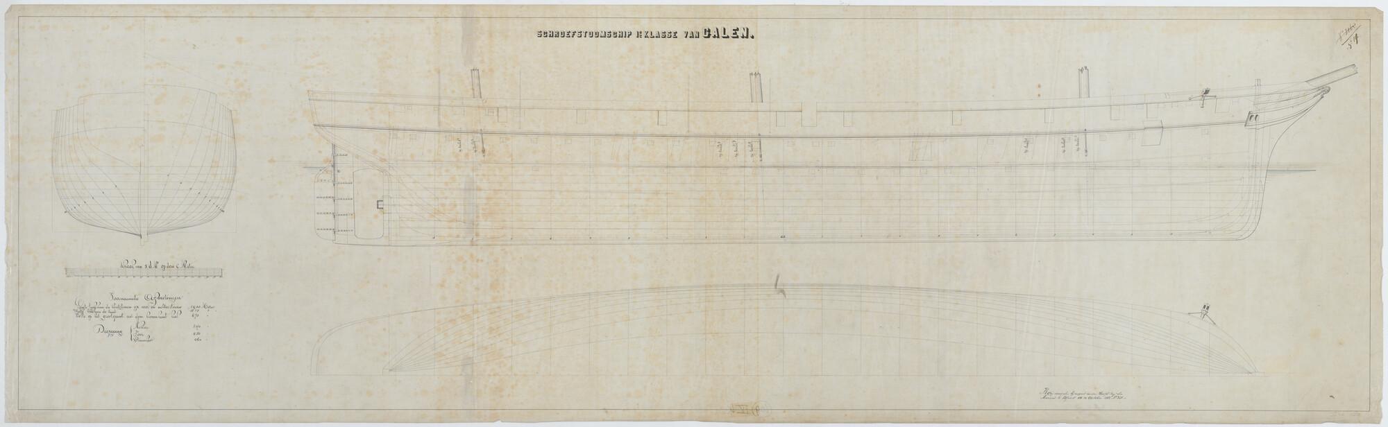 Het schroefstoomschip 1ste klasse Zr.Ms. "Van Galen", 1868. zijaanzicht met spantenraam en waterlijnen.
