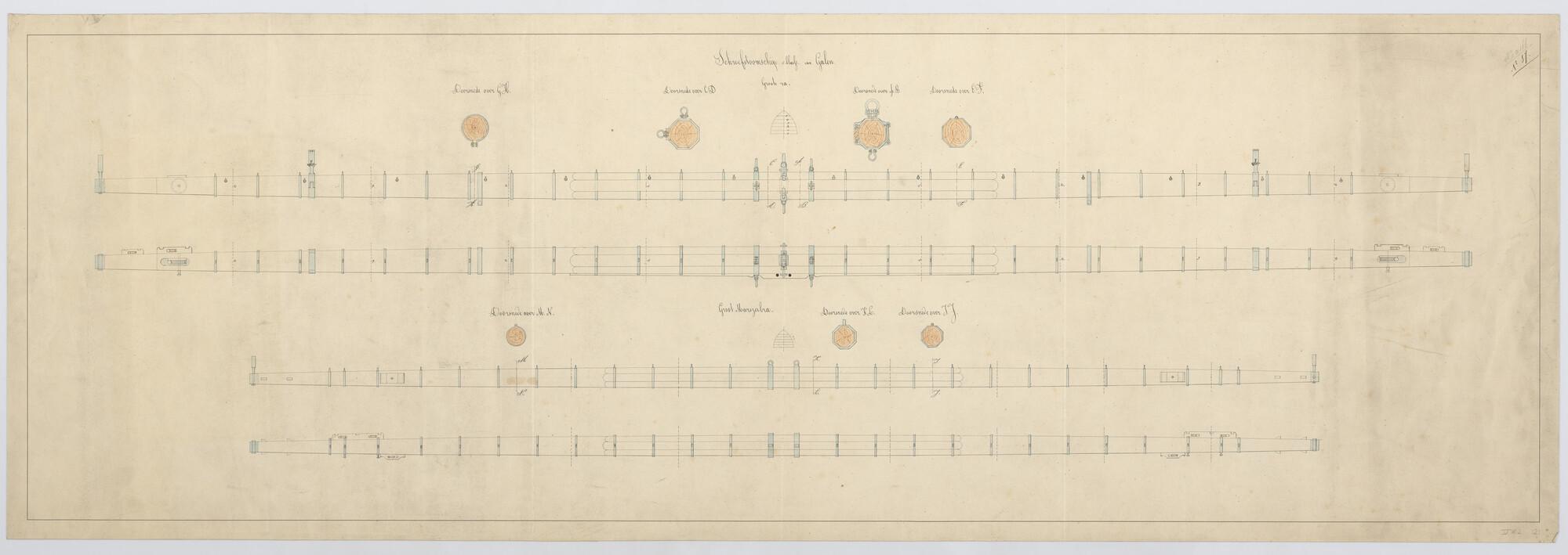 Het schroefstoomschip 1ste klasse Zr.Ms. "Van Galen", 1868. Grote ra en mars ra in aanzicht en doorsnede.