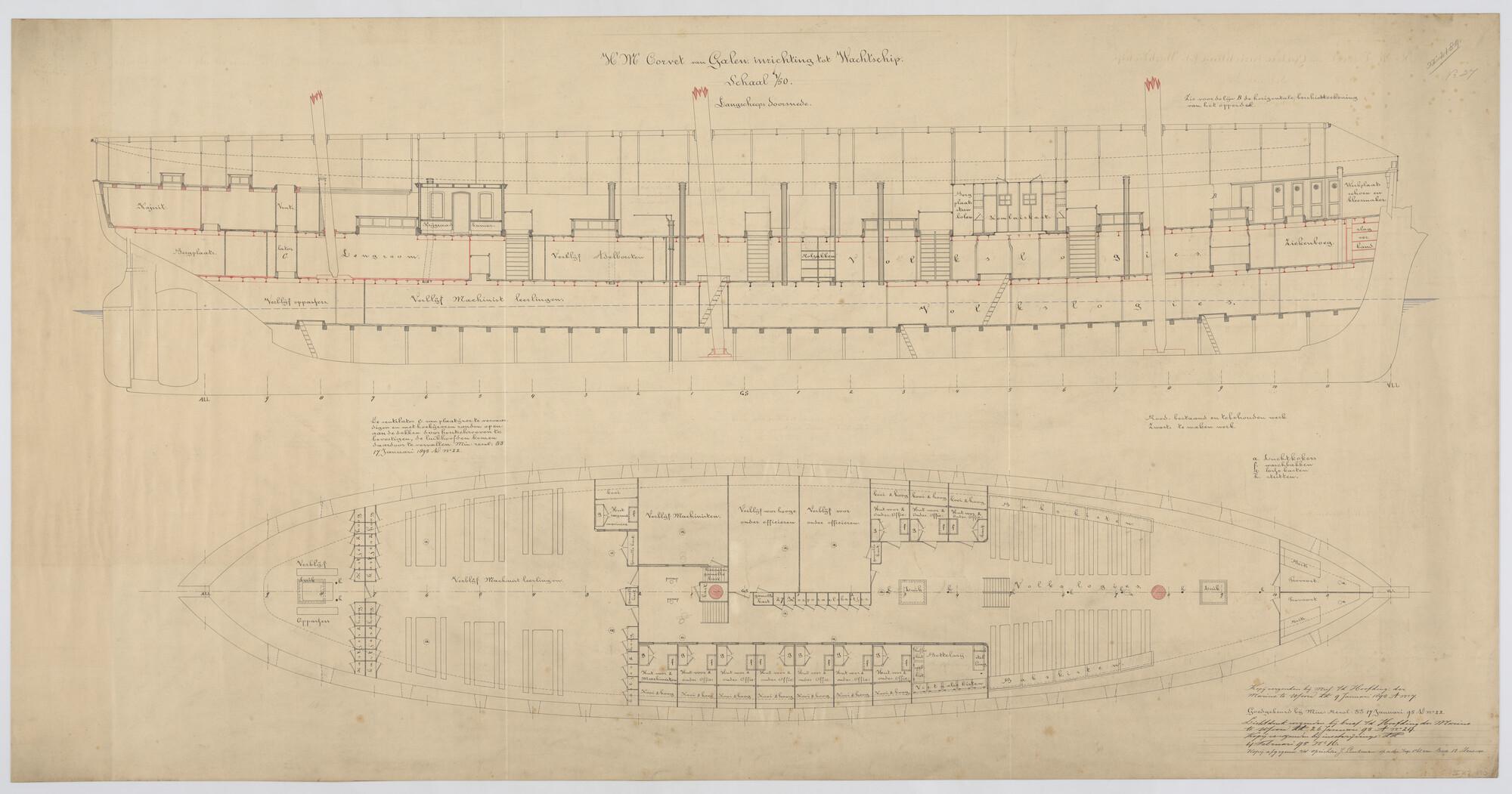Het schroefstoomschip 1ste klasse Zr.Ms. "Van Galen", 1868. verticale langsdoorsnede, en koebrugdek 1895.
