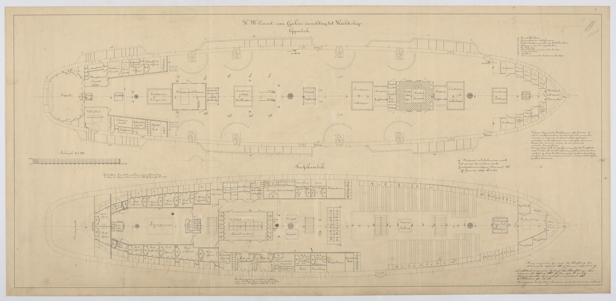 Het schroefstoomschip 1ste klasse Zr.Ms. "Van Galen", 1868. Opperdek en tussendek 1895.