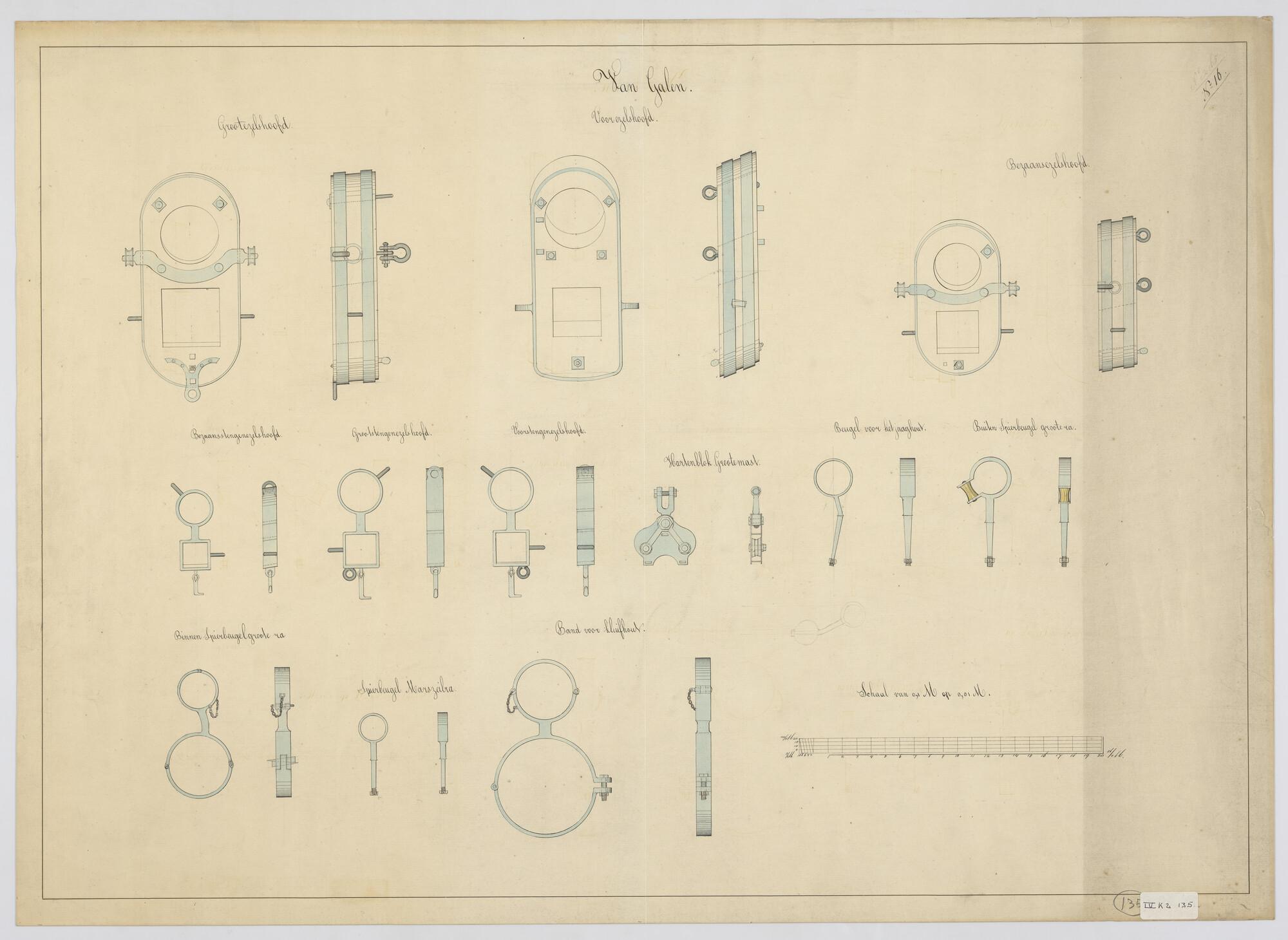Het schroefstoomschip 1ste klasse Zr.Ms. "Van Galen", 1868. Ezelshoofden, harteblok, beugels en banden.