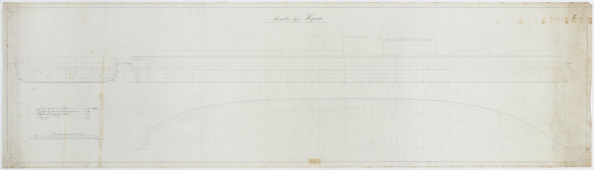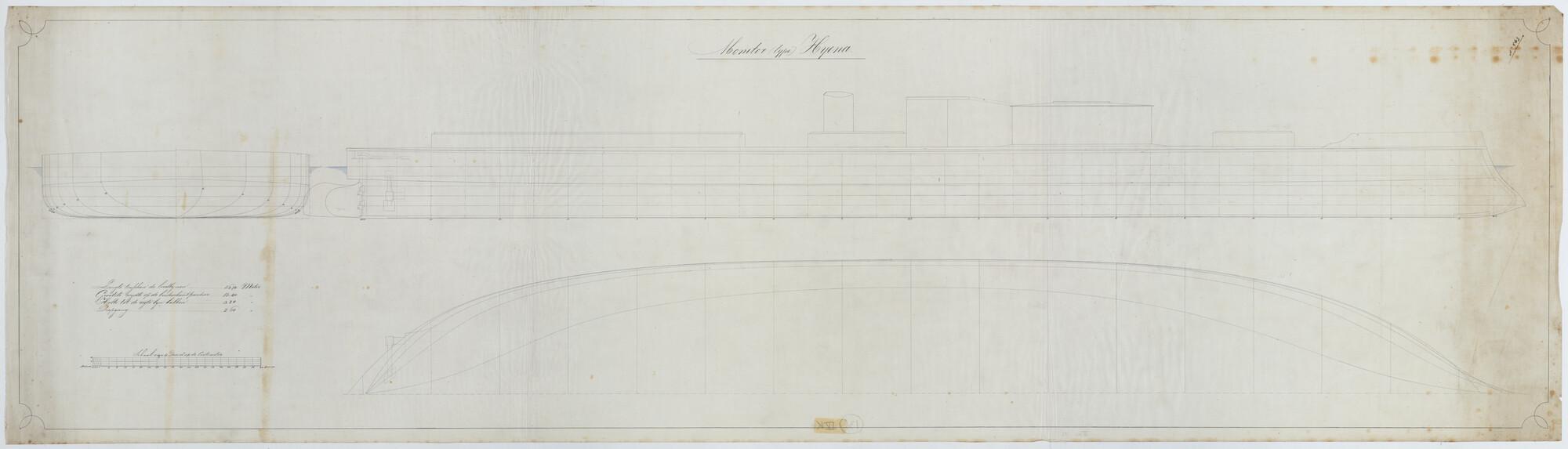 De monitor Zr.Ms. "Hyena", 1869: zijaanzicht, spantenraam en waterlijnen. Afmetingen 56.70 x 13.40 x 3.20 meter.