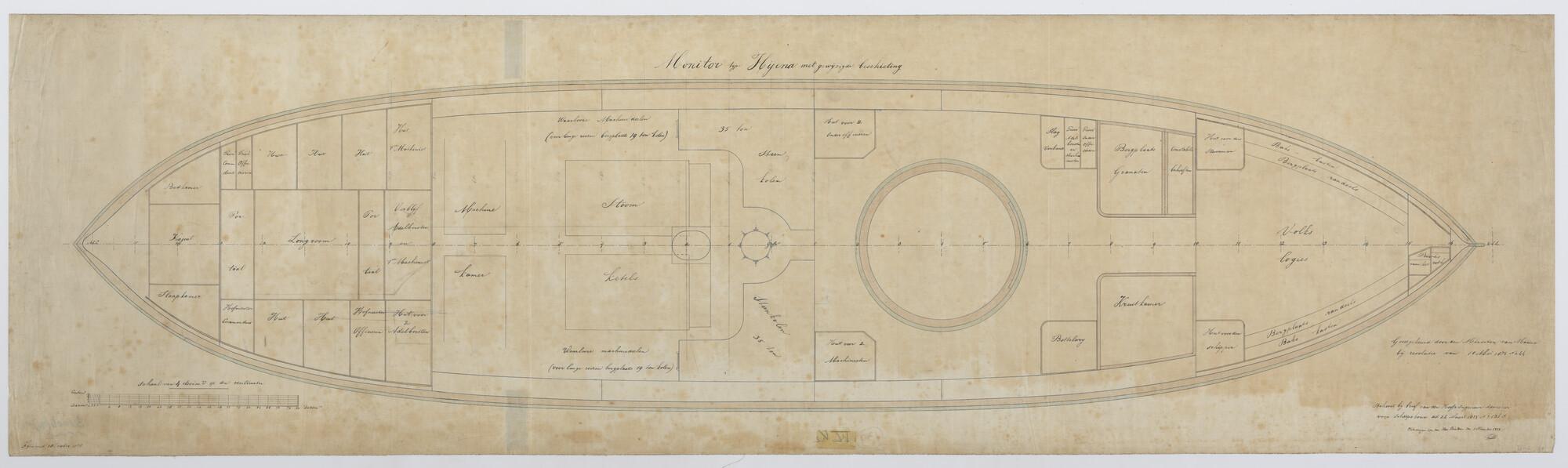 De monitor Zr.Ms. "Hyena", 1869. 56.70 x 13.40 x 3.20 meter. Beschieting tussendek.